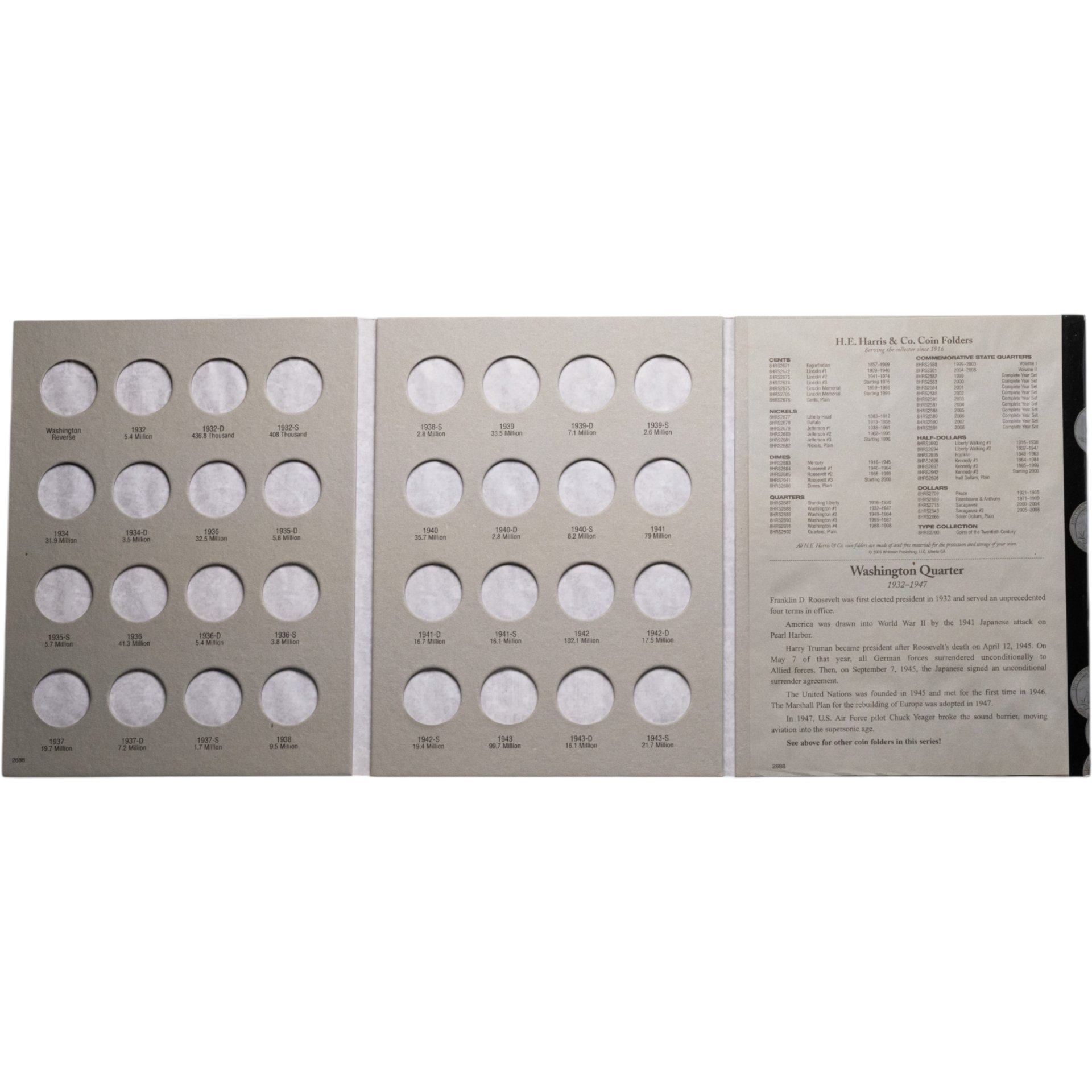 Этот качественный альбом-фолдер производства H.E. Harris & Co. предназначен для размещения монет Washington quarter, выпущенных с 1932 по 1947 год.