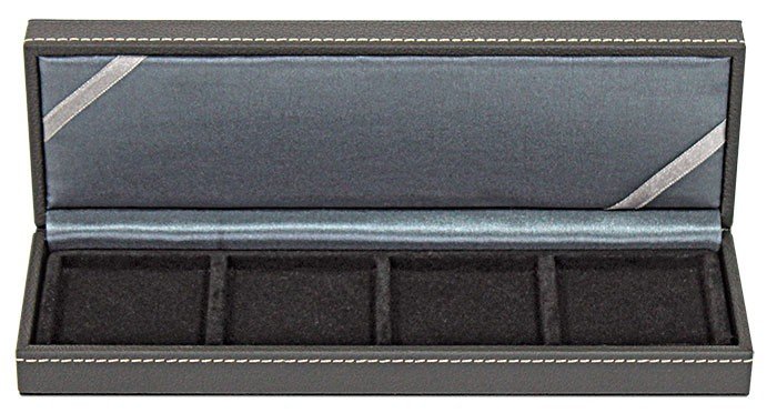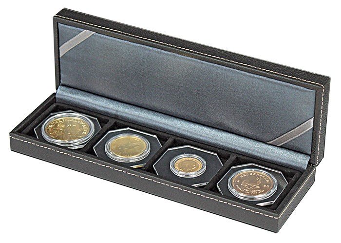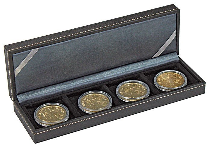 Антрацитовые подушки крышки образуют привлекательный контраст к имеющимся в распоряжении вкладышам и хранящимся в них монетам и прочим коллекционным объектам.