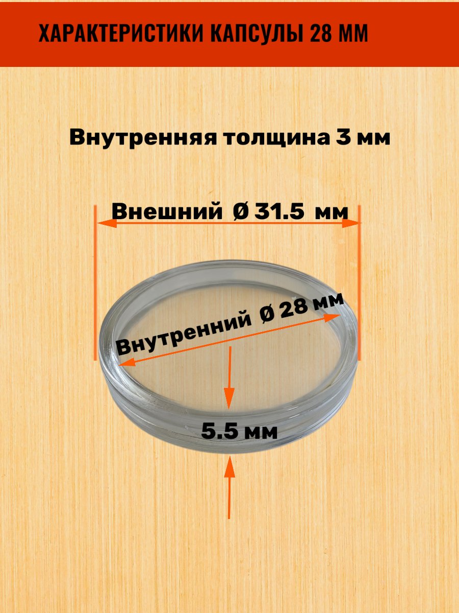 Внешний диаметр капсулы для монет 33,1мм, внутренний диаметр 28 мм. Внутренняя толщина 2,8 мм. Внешняя толщина 5,2мм.