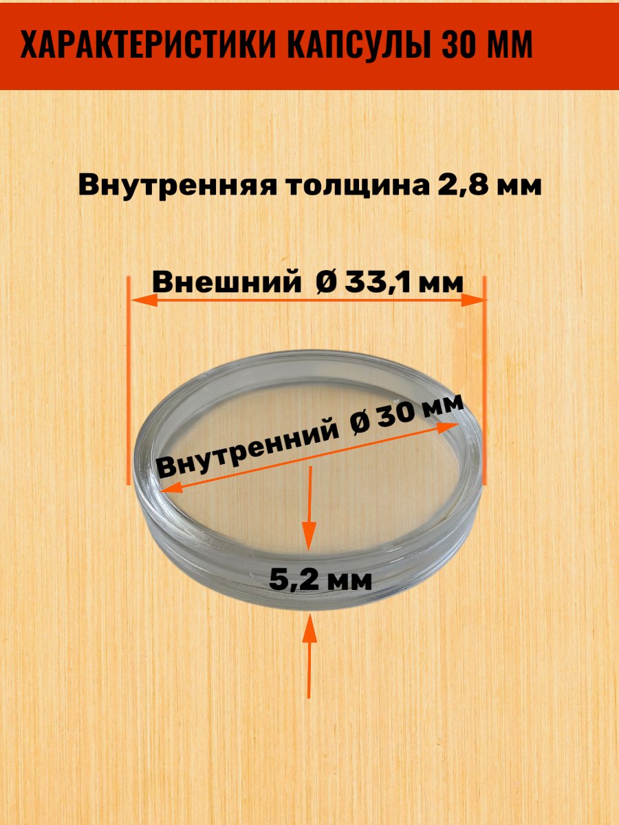 Внешний диаметр капсулы для монет 33,1мм, внутренний диаметр 30 мм. Внутренняя толщина 2,8 мм. Внешняя толщина 5,2мм.