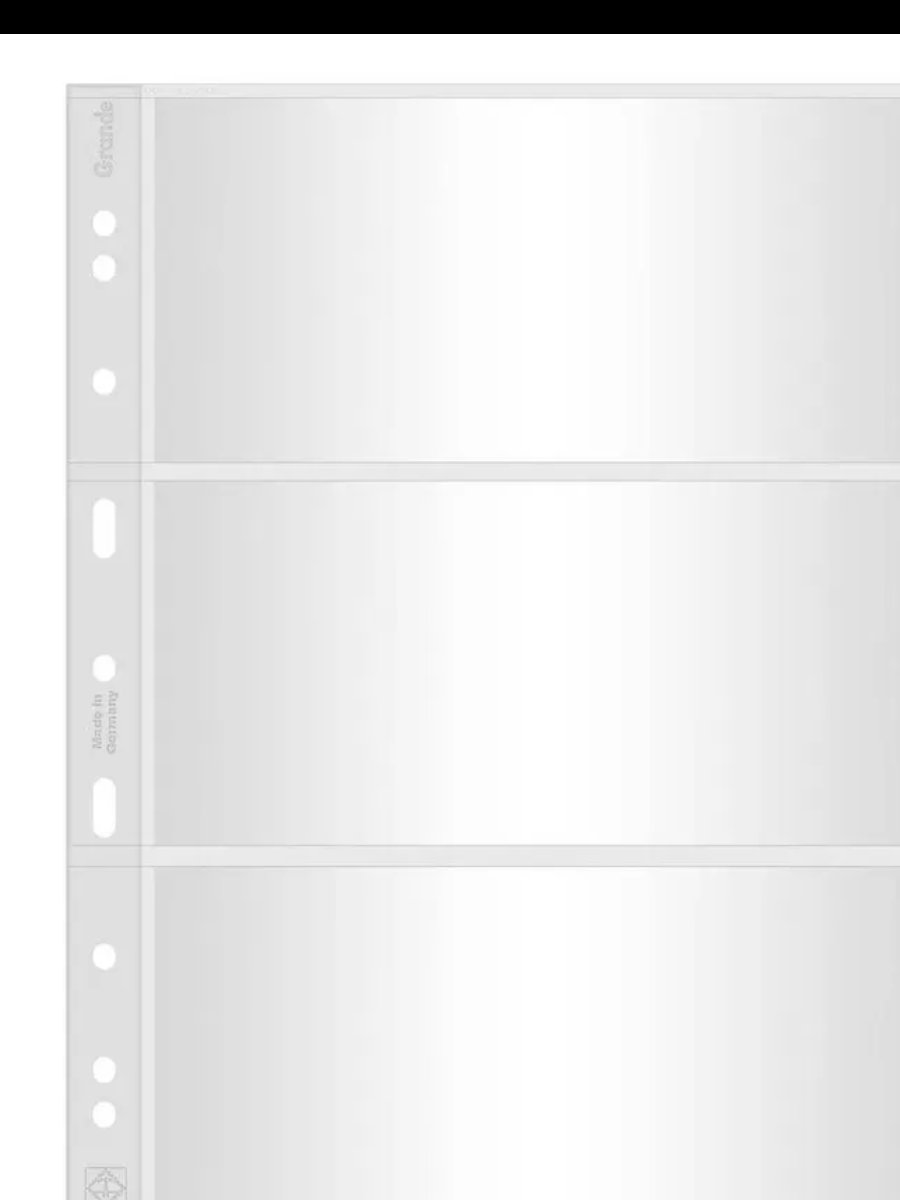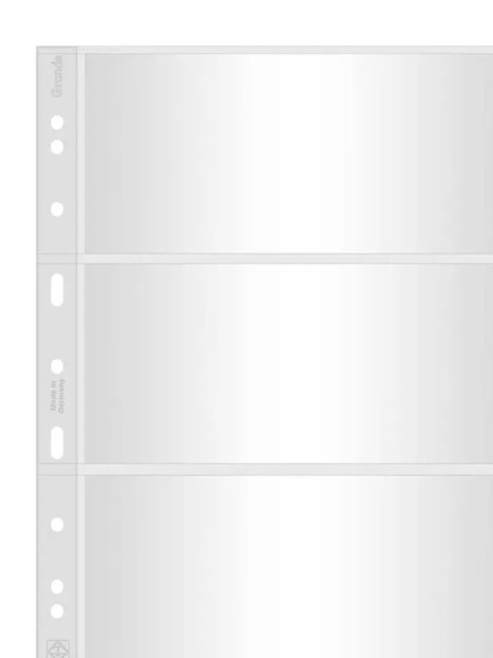 В изготовлении листов, капсул, холдеров, других аксессуаров Leuchtturm использует твёрдый инертный полипропилен, полиэстер и другие, безопасные для коллекционных предметов материалы. Сертификаты качества на всю продукцию компании свидетельствуют о её надёжности и долговечности. Лист Leuchtturm формата GRANDE 3C разработан для хранения трёх бон, его размер – 216х98 мм. Коллекционные банкноты просматриваются с обеих сторон.