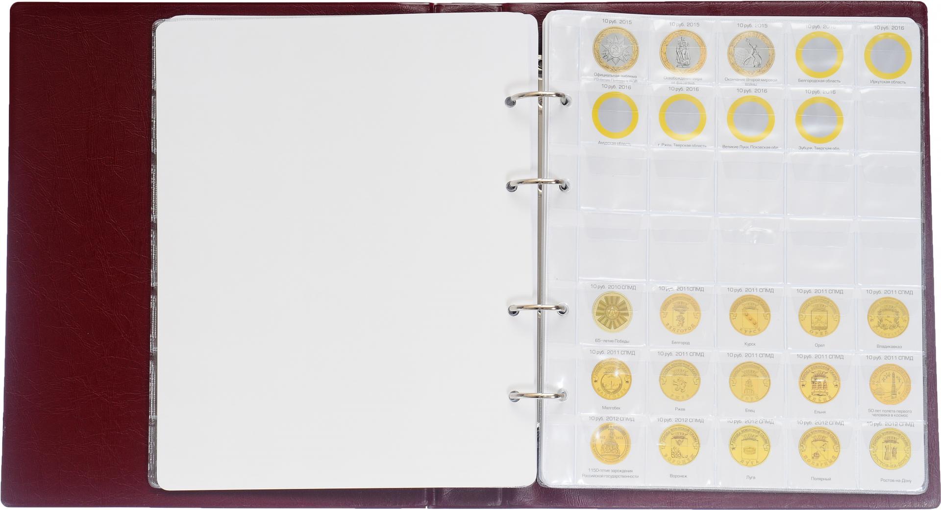 Папка на кольцах формата OPTIMA, содержит 8 листов ПВХ под все основные юбилейные монеты РФ, снабжена цветными вставками с изображениями монет.