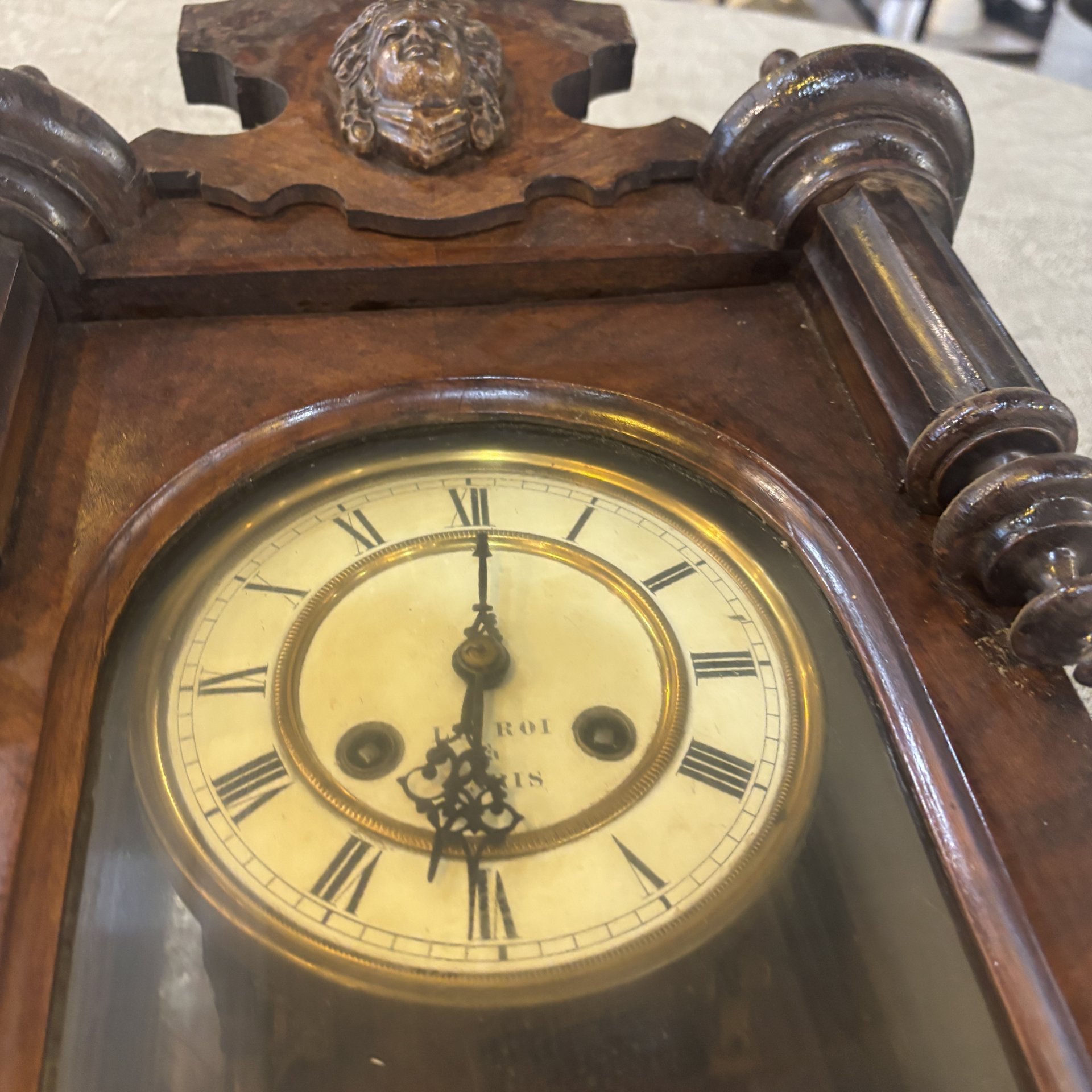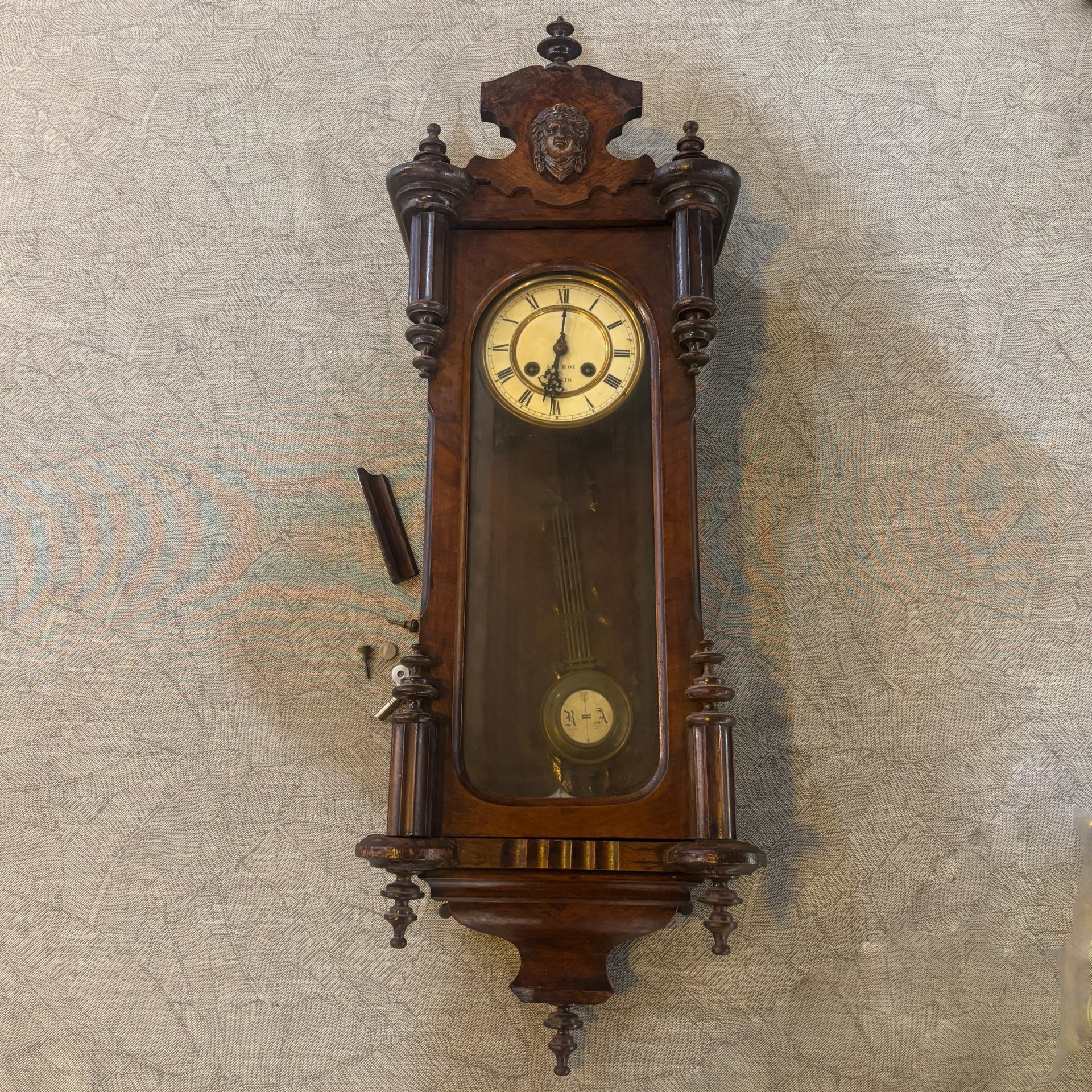 Часы настенные в корпусе c декором в виде боковых колонн на створке (марка "E.R. Sehlanker"), ключ в комплекте, дерево, металл, стекло, Германия, 1890-1910 гг.