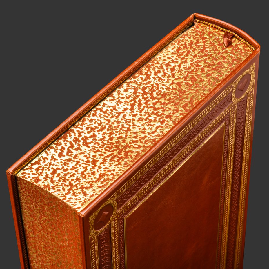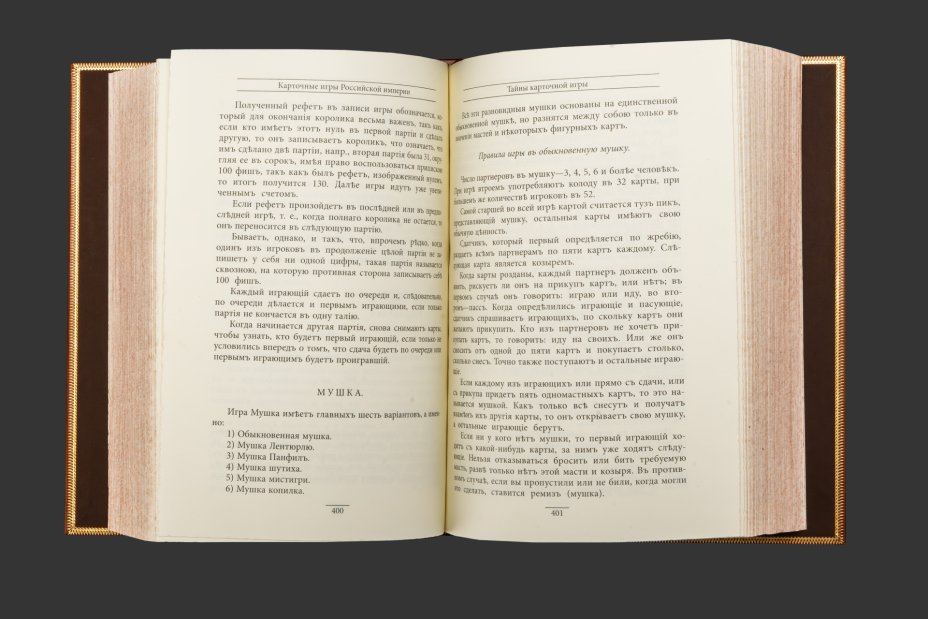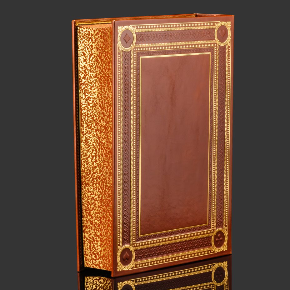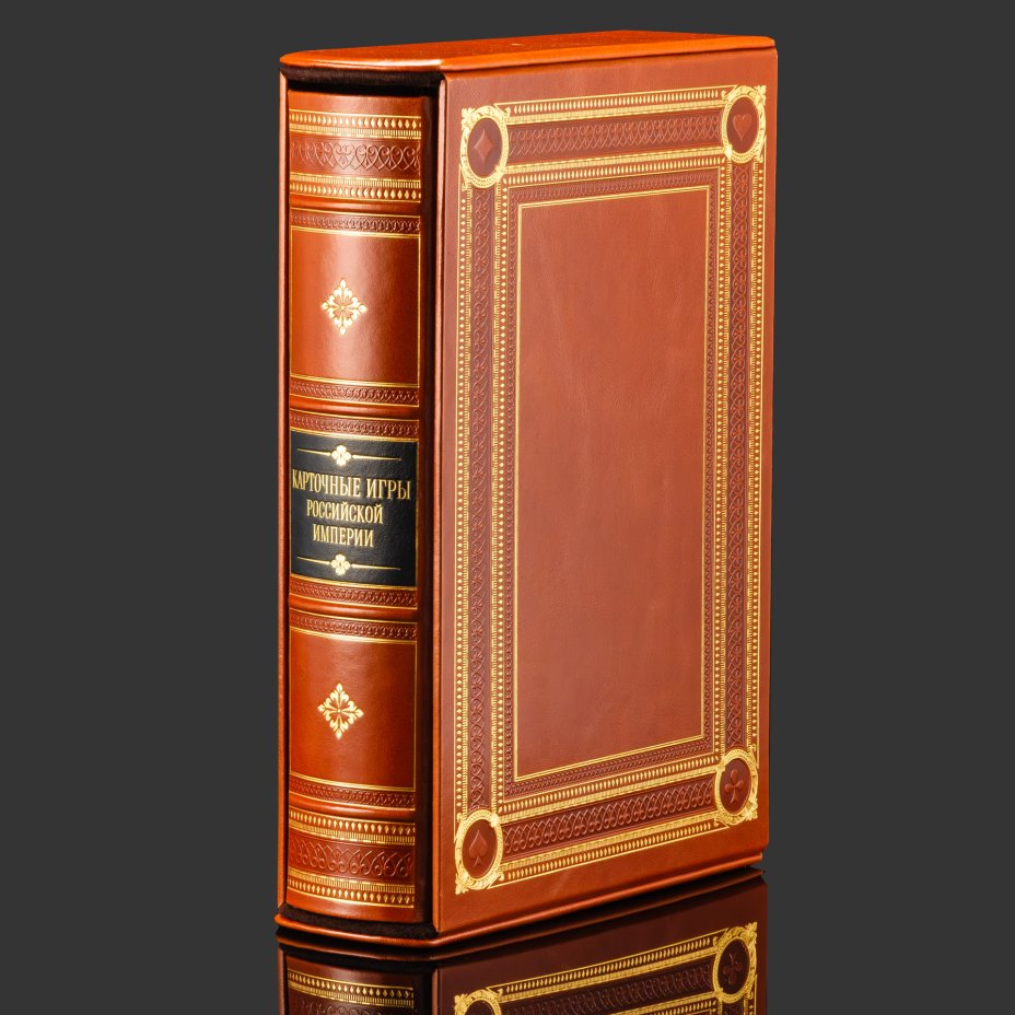 Книга в кожаном переплете "Карточные игры Российской империи" в футляре, бумага, кожаный переплет, тиснение, золочение, обрез с золочением; в футляре, обтянутом кожей и бархатной подарочной упаковке, Российская Федерация, 2025 г.