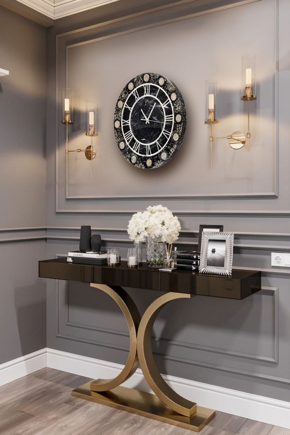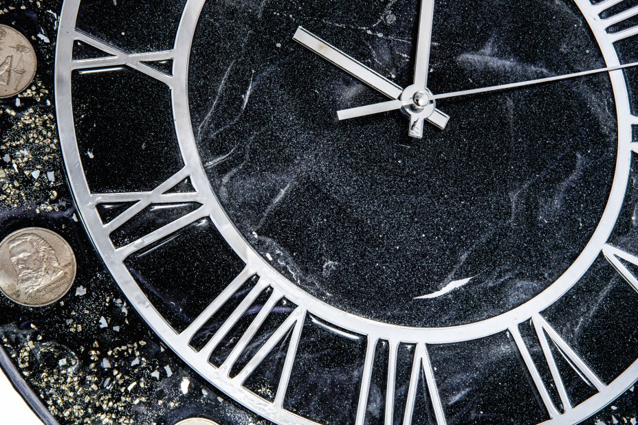 Часы настенные "Не 50 оттенков серого", авторская ручная работа в технике Resin Art, поделочный камень, Глянцевое 3D покрытие, МДФ, металл, Российская Федерация, 2022 г.