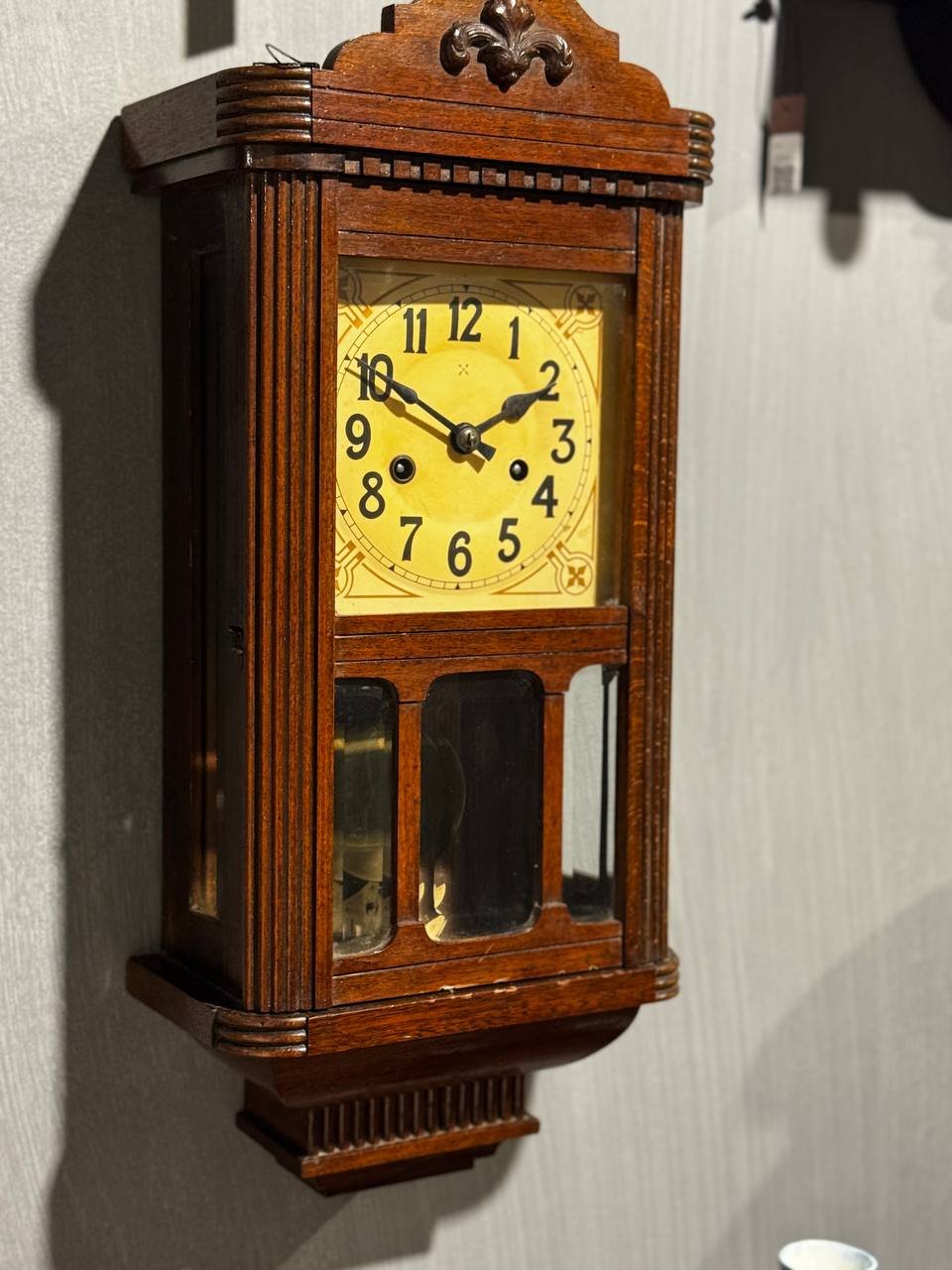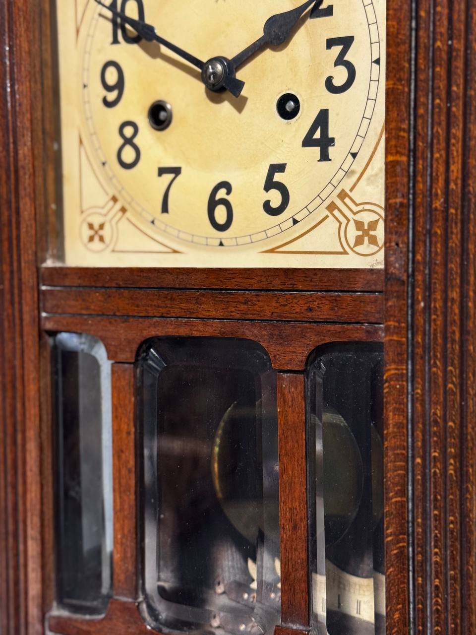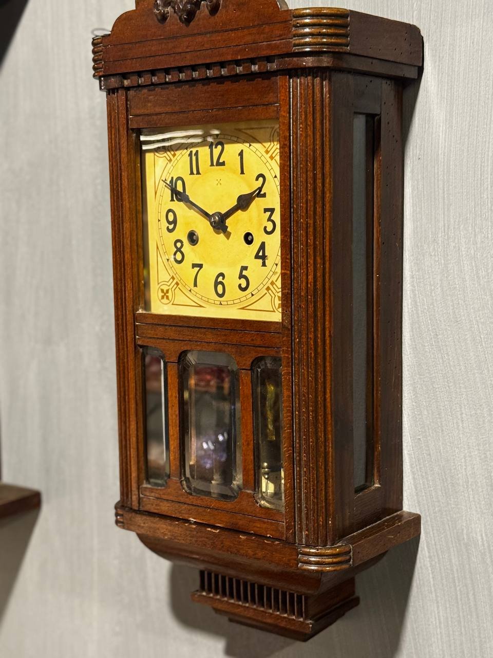 Часы настенные (четвертные) в расстеклованном корпусе в стиле модерн, дерево, резьба, металл, стекло, Junghans, Германия, 1911 г.