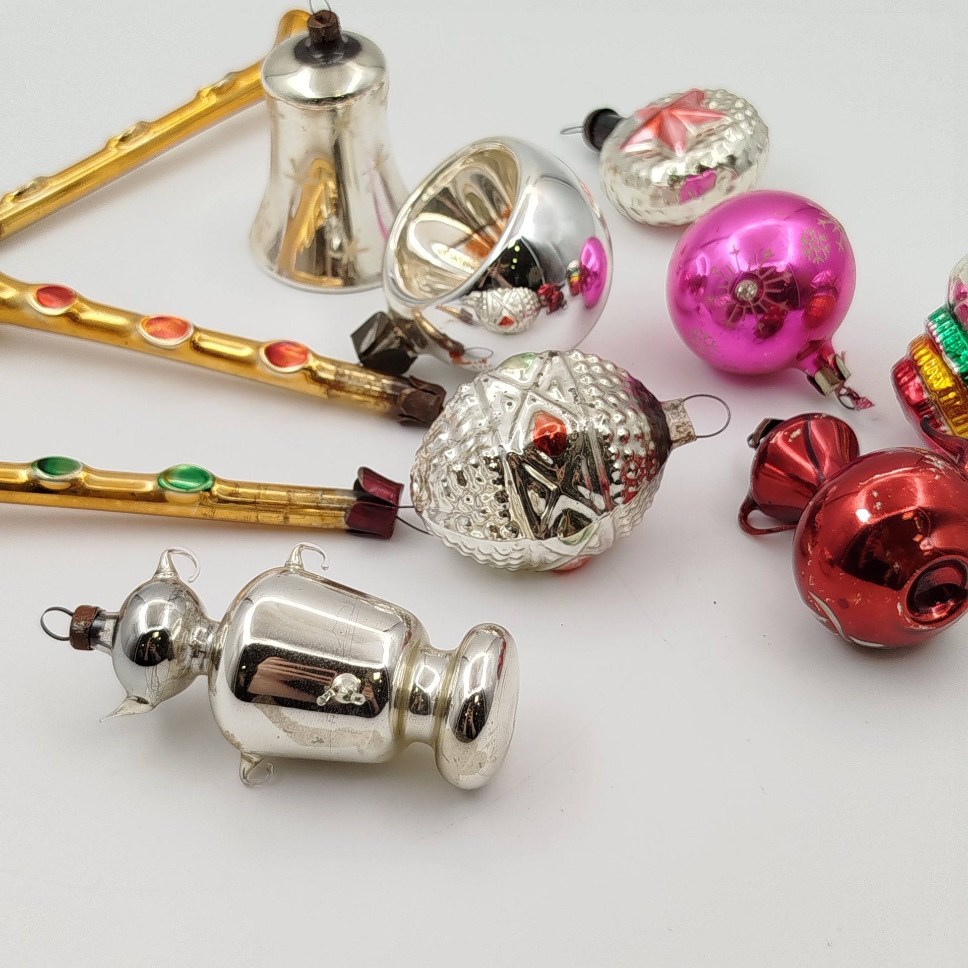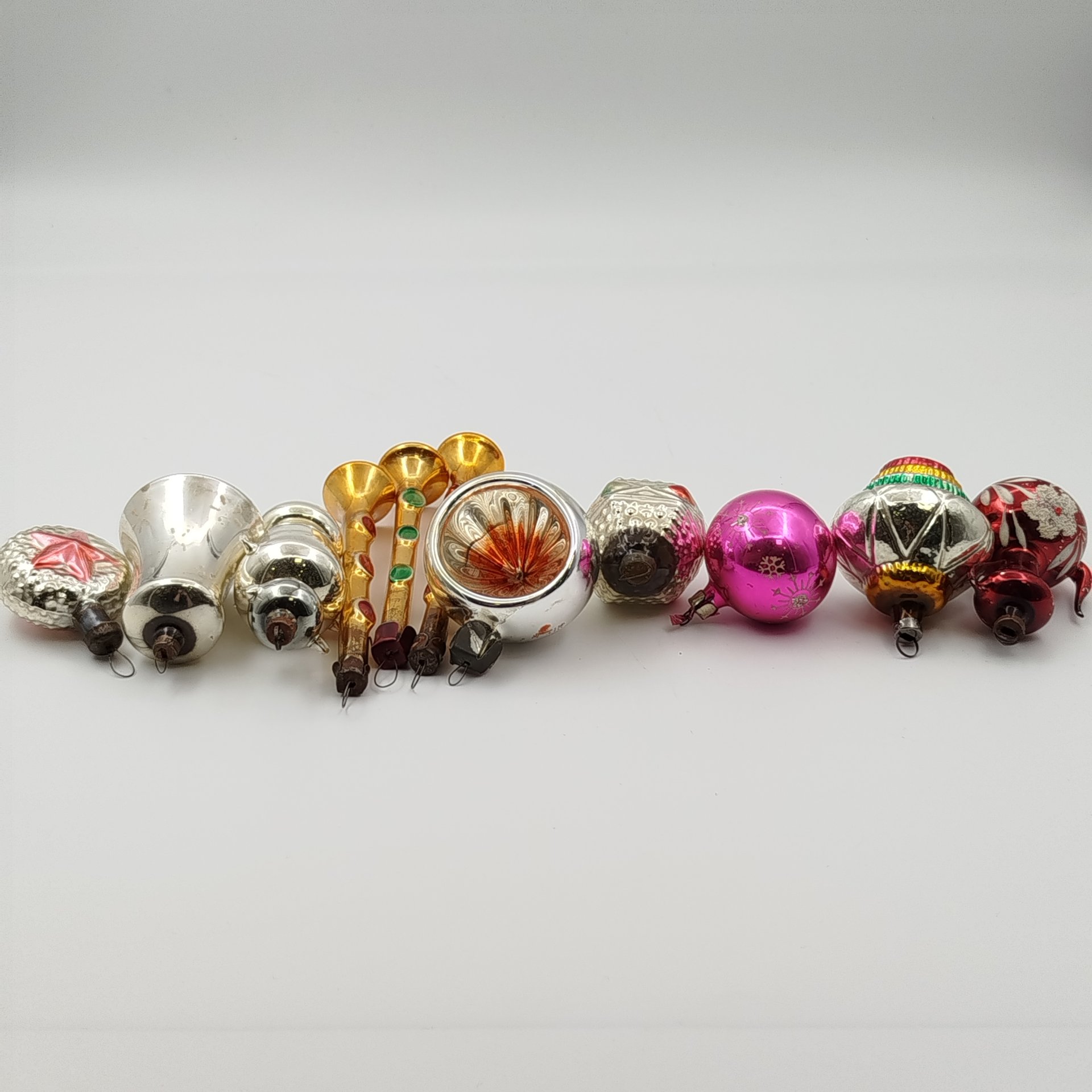 Набор из 14 ёлочных игрушек разных форм и расцветок, стекло, краска, металл, СССР, 1950-1970 гг.
