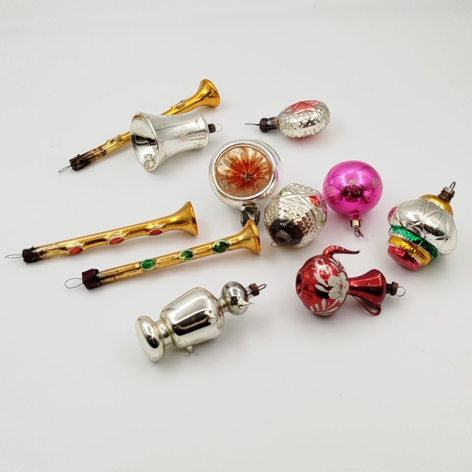 Набор елочных игрушек различных форм и расцветок (8 шт.), стекло, роспись, металл, СССР, 1950-1960 гг.