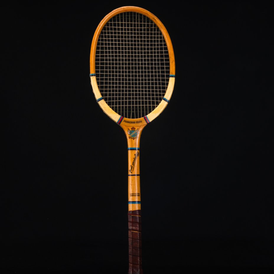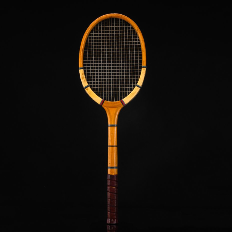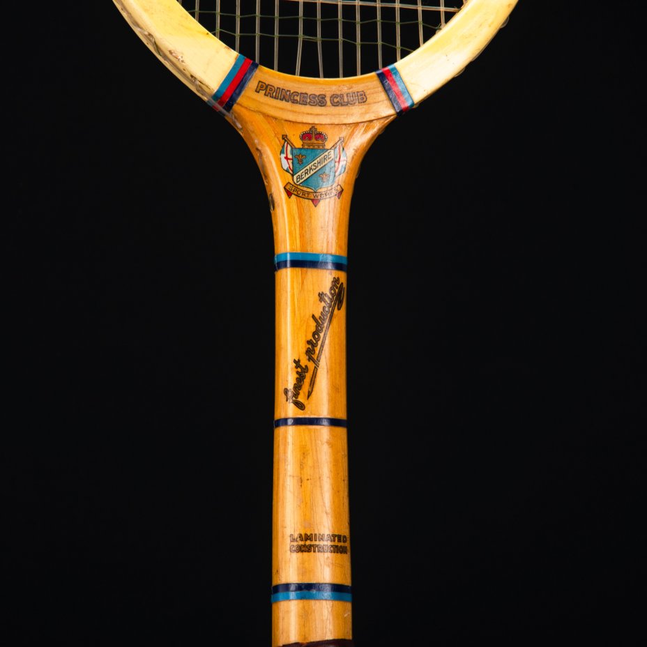 Ракетка для бадминтона с струбциной, дерево, металл, деколь, лак, кожа, полимерный материал, Великобритания, 1950-1970 гг.