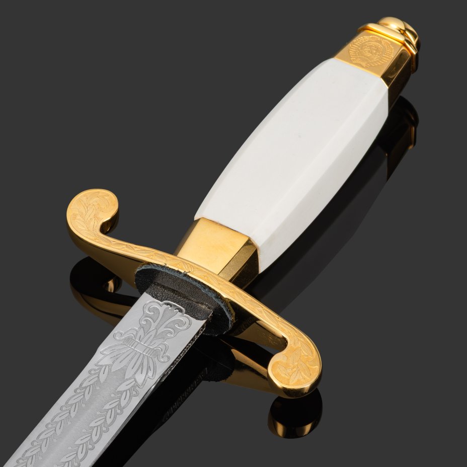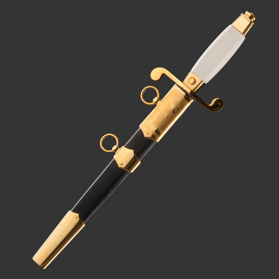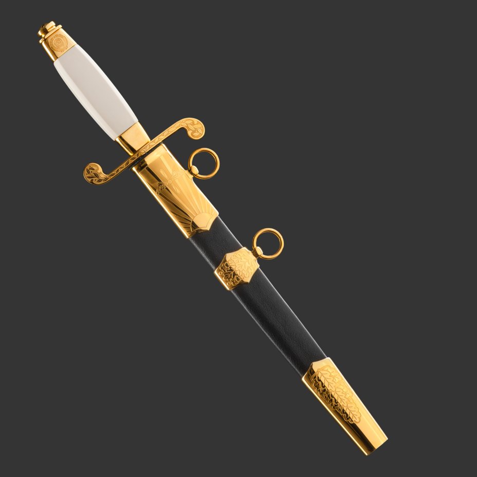 Кортик офицерский "ВВС", сталь, латунь, дерево, черная кожа, неолейкорит, золочение; в деревянном подарочном коробе с бархатным ложементом, Российская Федерация, 2024 г.