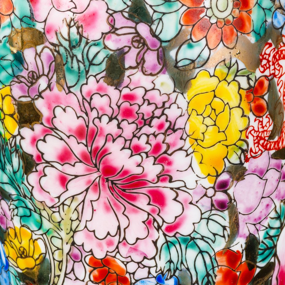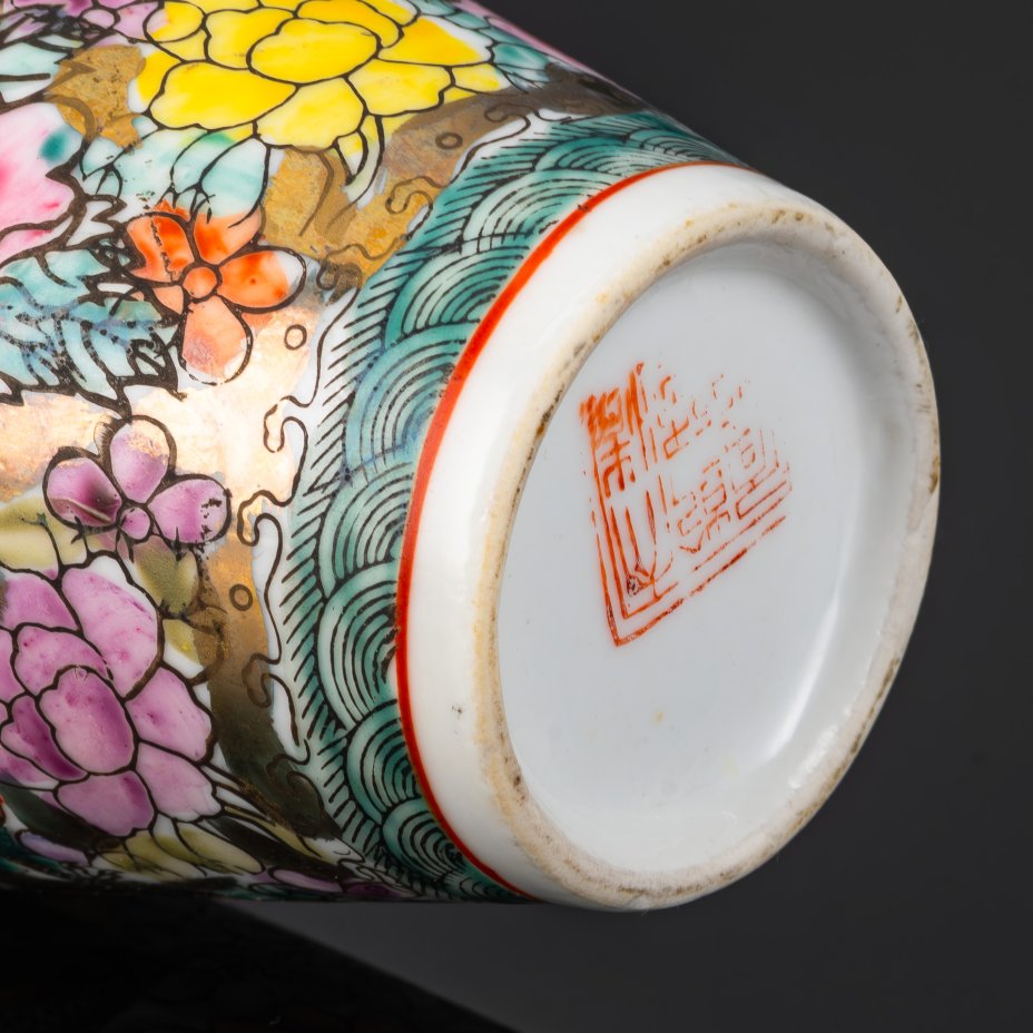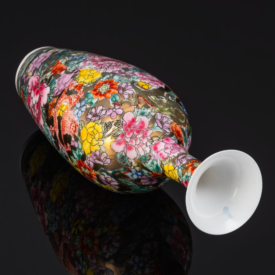 Ваза изящной формы, декорированная драконами-лун и цветами на золотом фоне, фарфор, роспись эмалевыми красками, золочение, Китай, 1960-1980 гг.