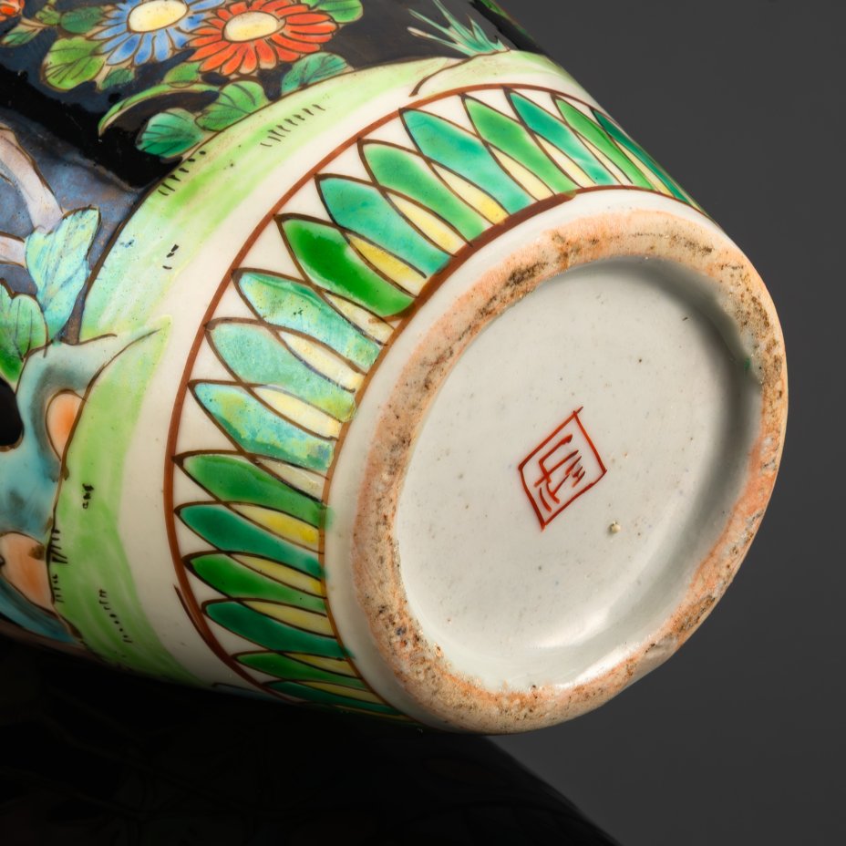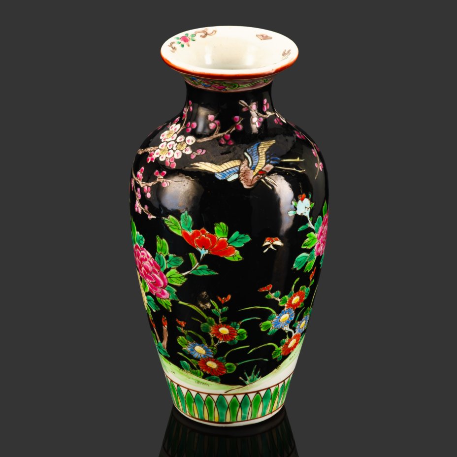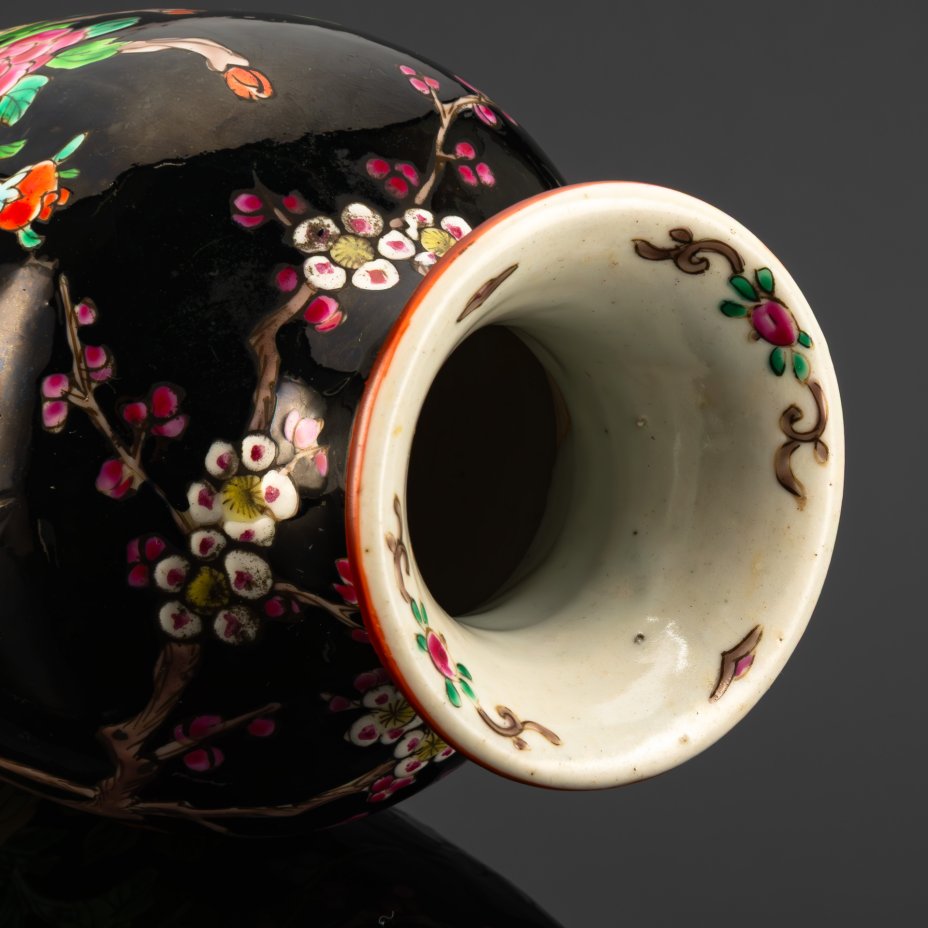 Ваза в стиле шинуазри "цветы и птицы" с изображением журавлей, цветущей вишни и пионов на черном фоне, фарфор, роспись эмалевыми красками, Китай, 1960-1980 гг.