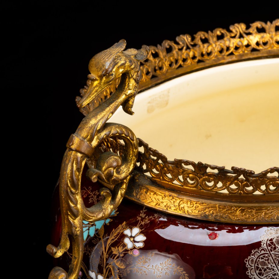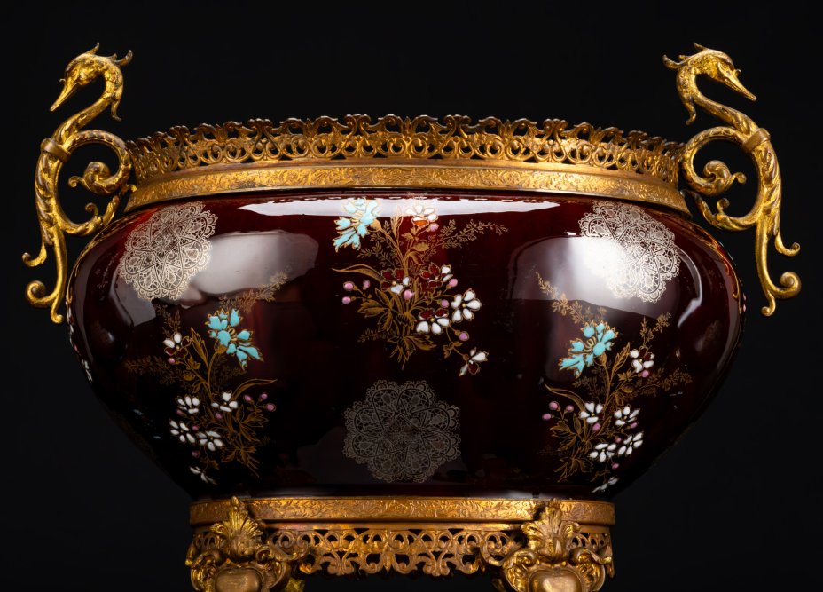 - Материал: Фаянс, латунь, роспись эмалями, крытье, золочение