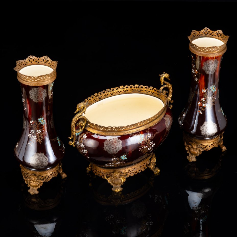 Интерьерное каминное трио для цветочных композиций (две вазы и кашпо), фаянс, латунь, роспись эмалями, крытье, золочение, Boch Freres Keramis, Бельгия, 1900-1920 гг.