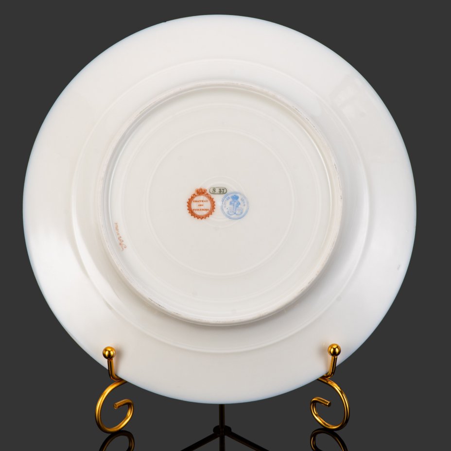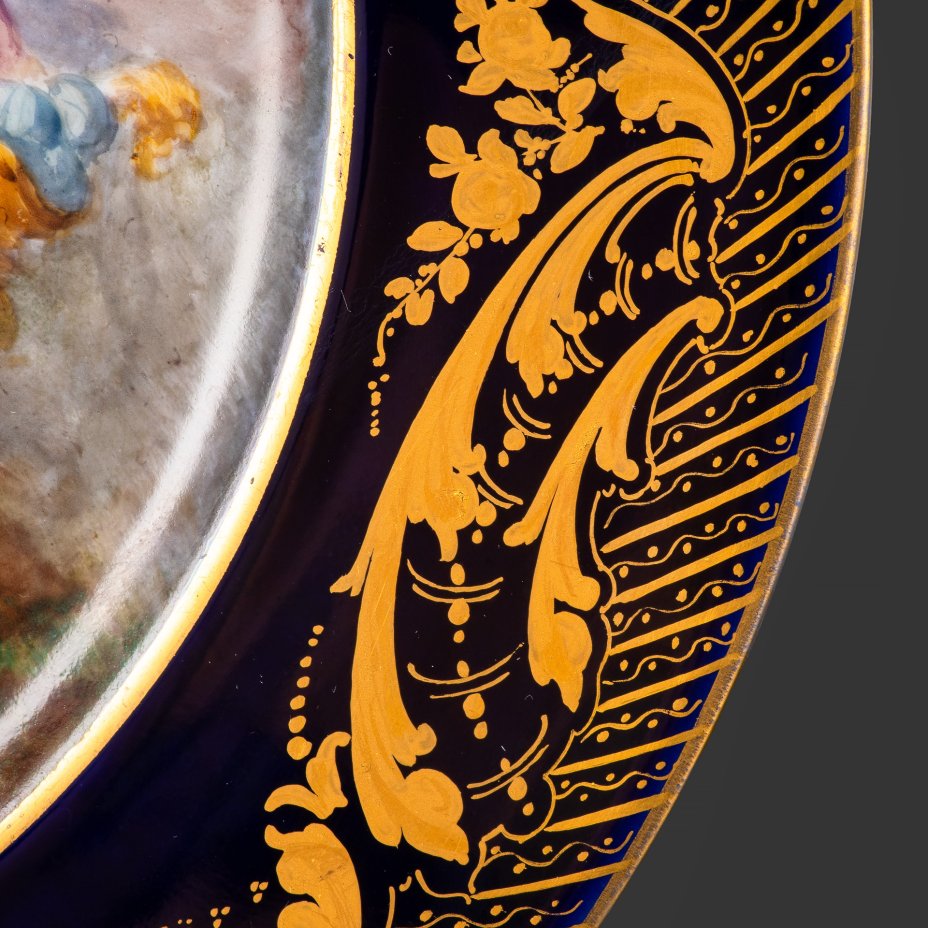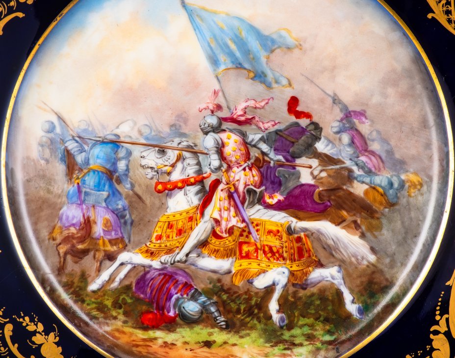 Тарелка декоративная с батальным сюжетом "Битва при Форново" (выполнена для дворца Тюильри "Chateau des Tuileries"), фарфор, крытье кобальтом, золочение, цировка, роспись, Севрская фарфоровая мануфактура (Sevres), Франция, 1844 г.