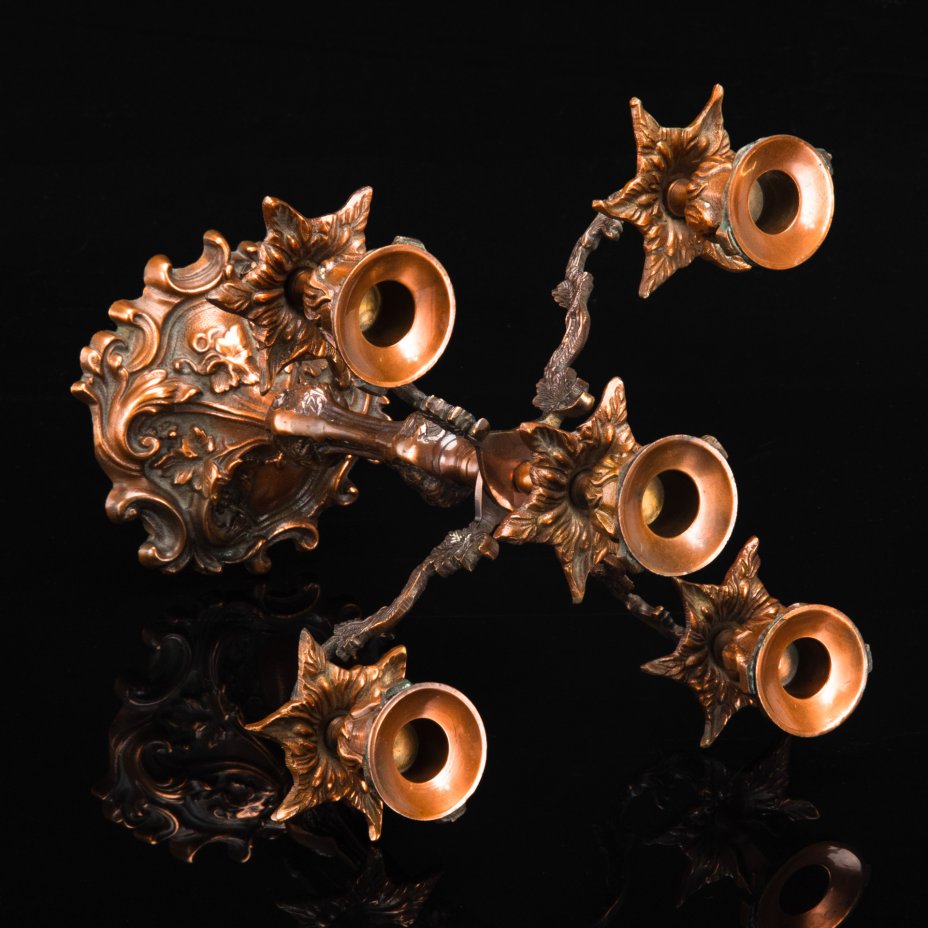 Канделябр на пять свечей, украшенный изображениями виноградной лозы, сплав металлов на основе меди, формовка, Западная Европа, 1980-1990 гг.