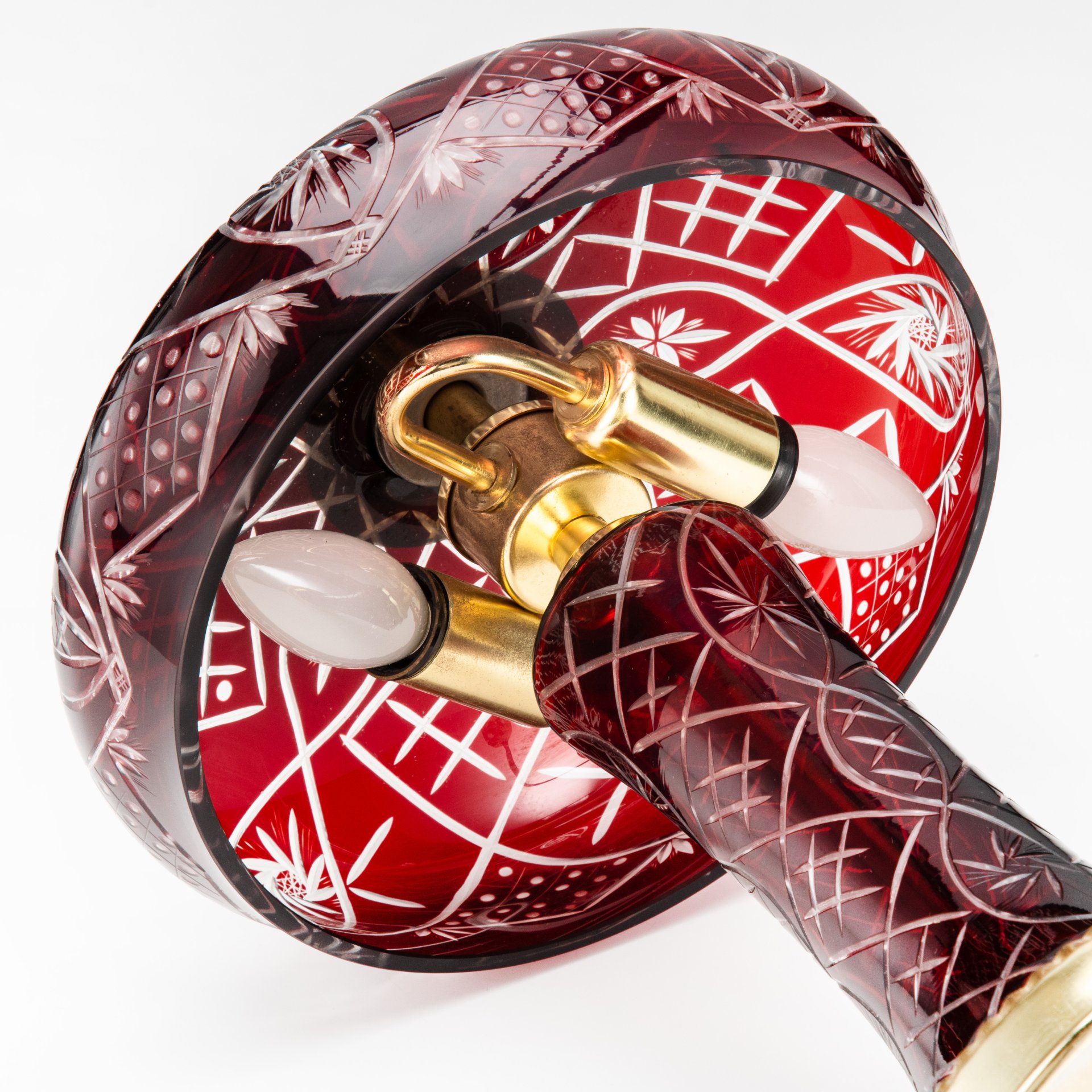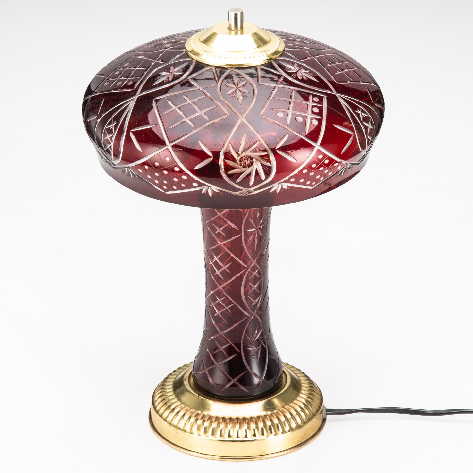 Лампа настольная рубинового цвета с резным орнаментом, хрусталь, алмазная грань, сплав металлов, полимерный материал, Чехословакия, 1950-1980 гг.
