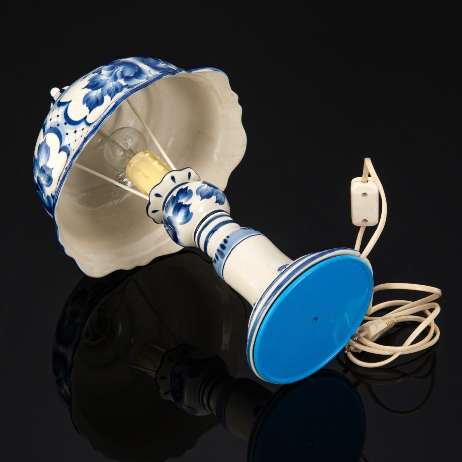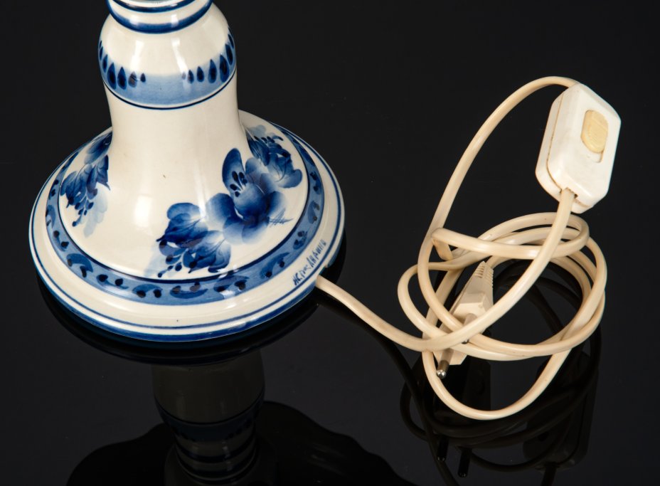 Лампа настольная, украшенная с цветочным декором, автор росписи Анрина, фарфор, металл, пластик, роспись, Гжельская фарфоровая мануфактура «Галактика», Российская Федерация, 1996-2010 гг.
