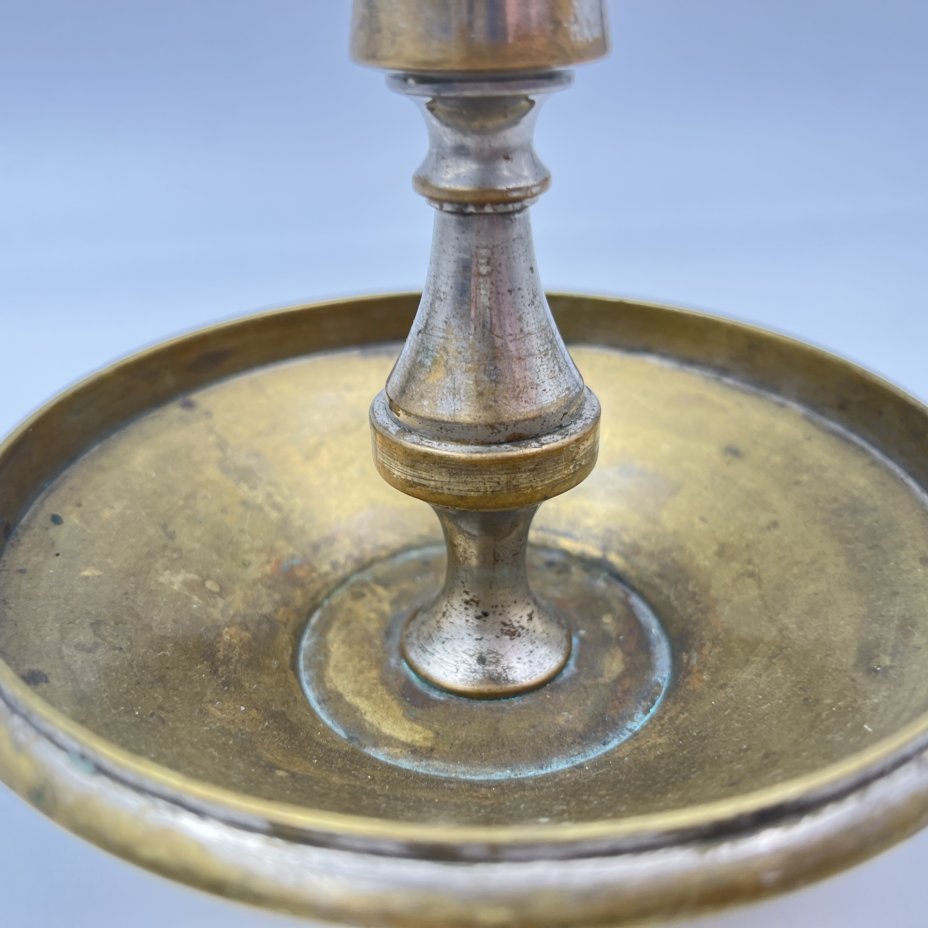 Подсвечник на одну свечу на высокой ножке с широкими поперечными вставками и отлогим широким венцом, клеймо "ТБЧ" (неизвестный тульский мастер), латунь, Российская империя, 1880-1915 гг.