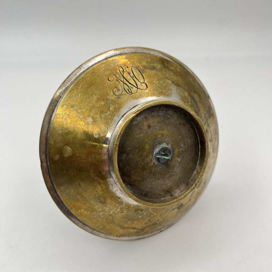 Подсвечник на одну свечу, на круглом основании, украшенный монограммой "МЮ", латунь, серебрение, Российская империя, 1890-1917 гг.