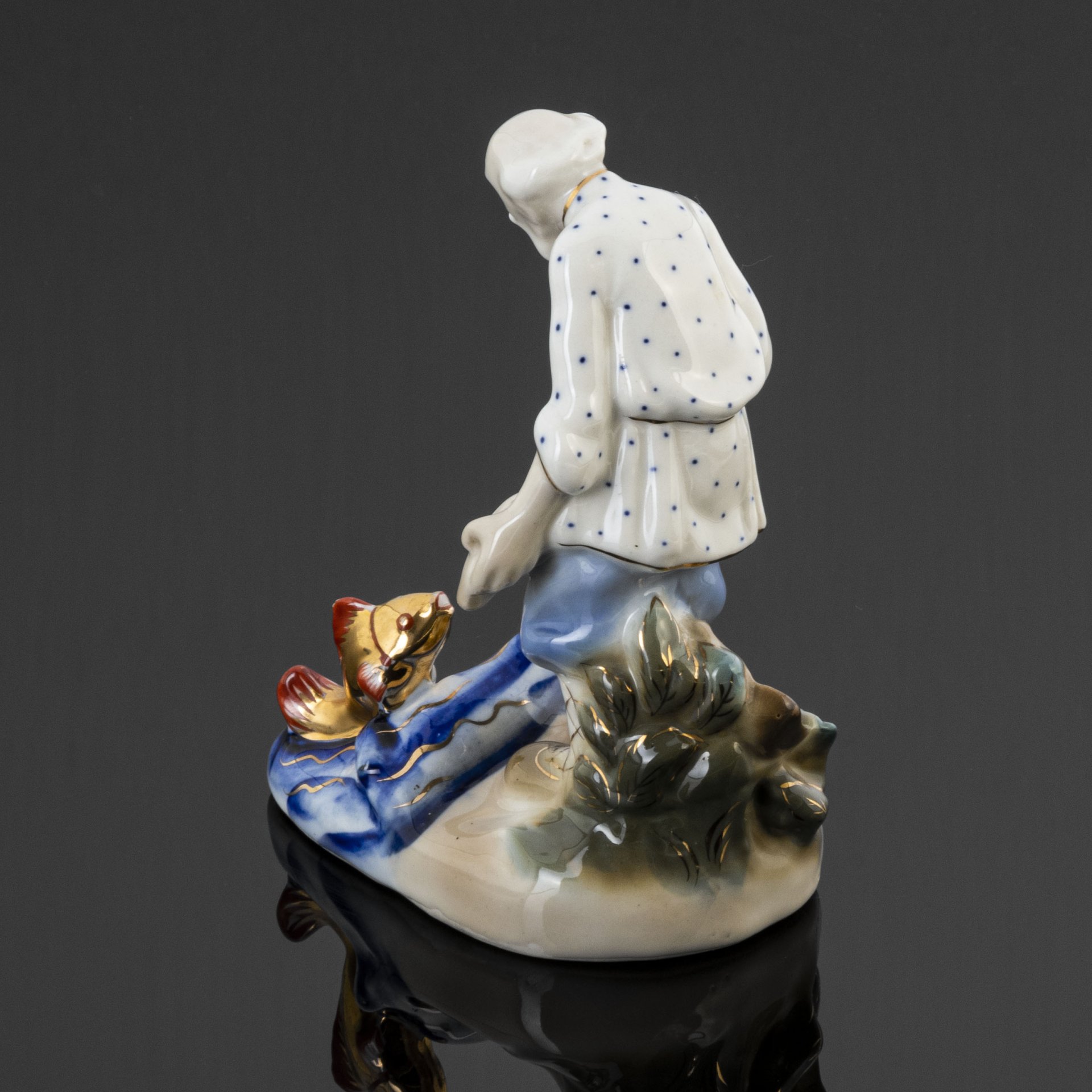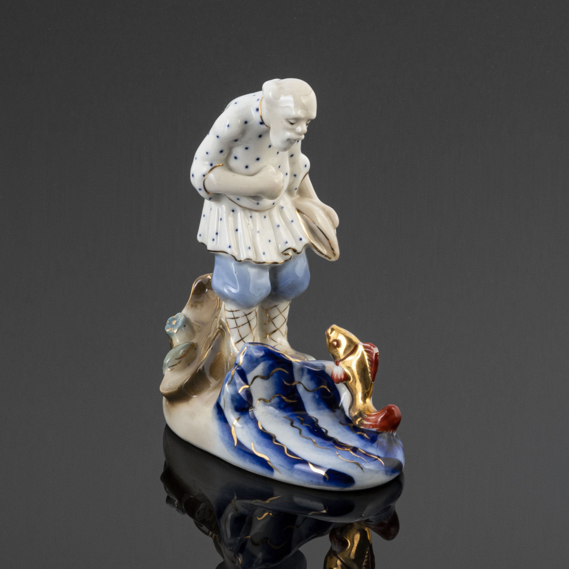Статуэтка "Старик и золотая рыбка", автор Л.П. Азарова, фарфор, роспись, золочение, Турыгинский фарфоровый завод артели «Художественная керамика» (Гжель), СССР, 1950-1960 гг.