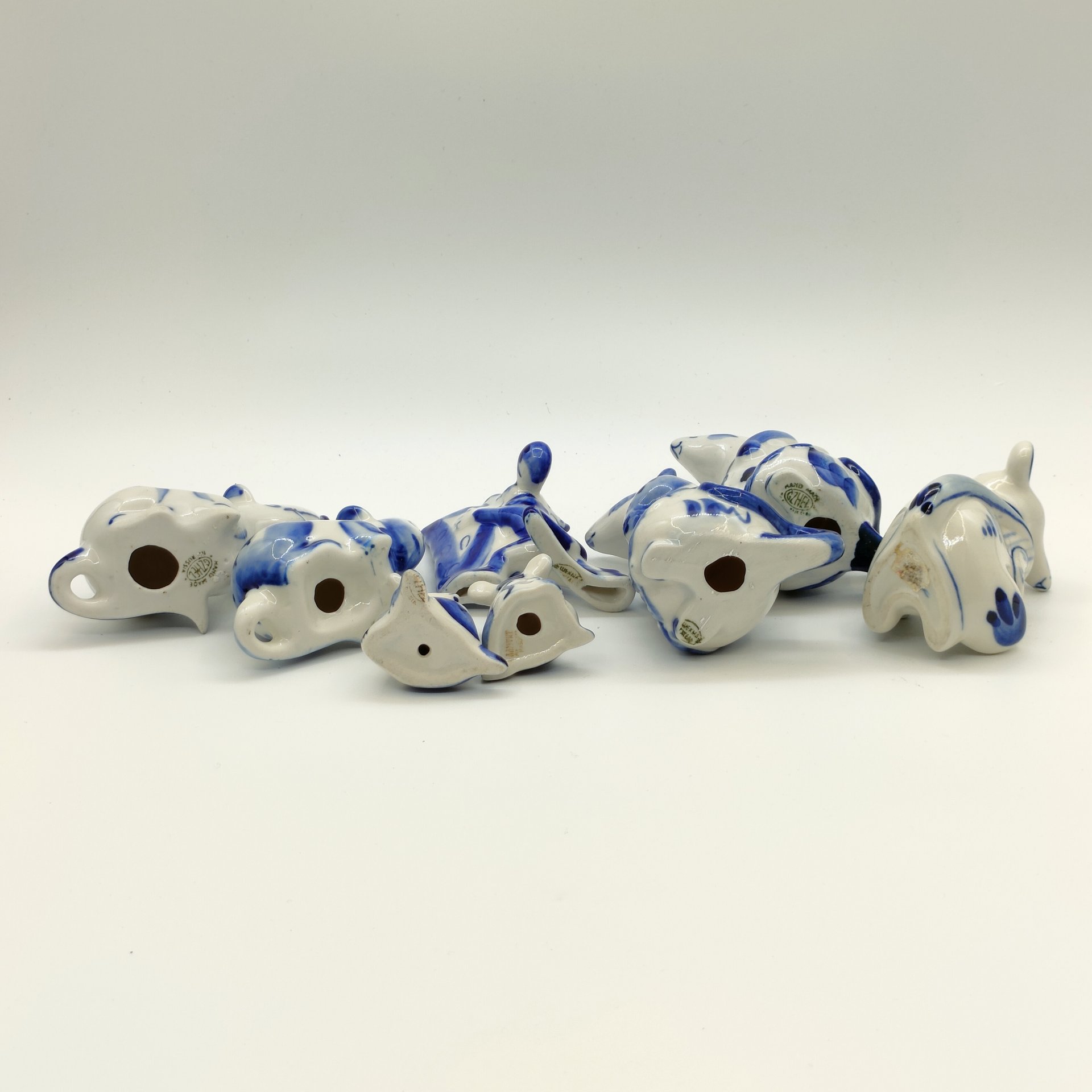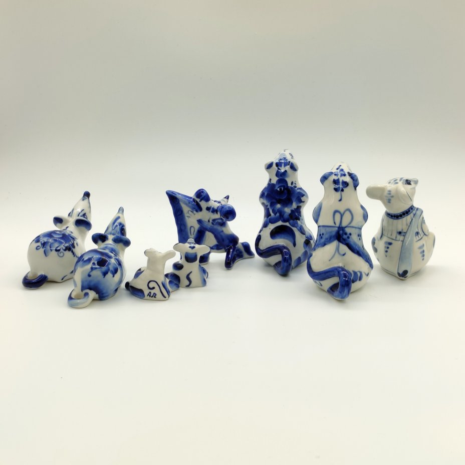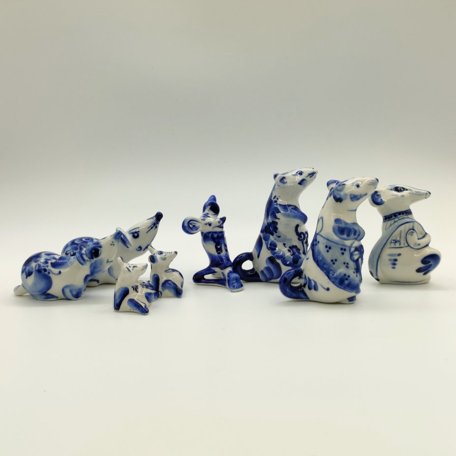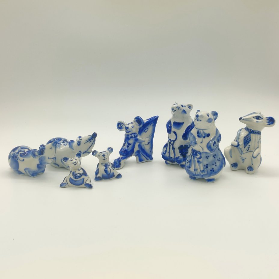 Набор из восьми статуэток "Крысы", Гжель, фарфор, роспись, Россия, 1990-2010 гг.