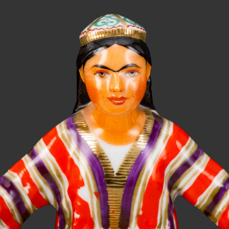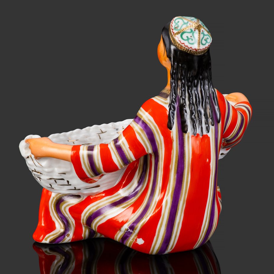 [Экспортное клеймо] Статуэтка "Узбечка с корзиной", скульпторы Столбова Г.С. и Григорьева Л.И., художник Лупанова Е.Н., фарфор, роспись, золочение, Ленинградский фарфоровый завод (ЛФЗ), СССР, 1970-1992 гг.