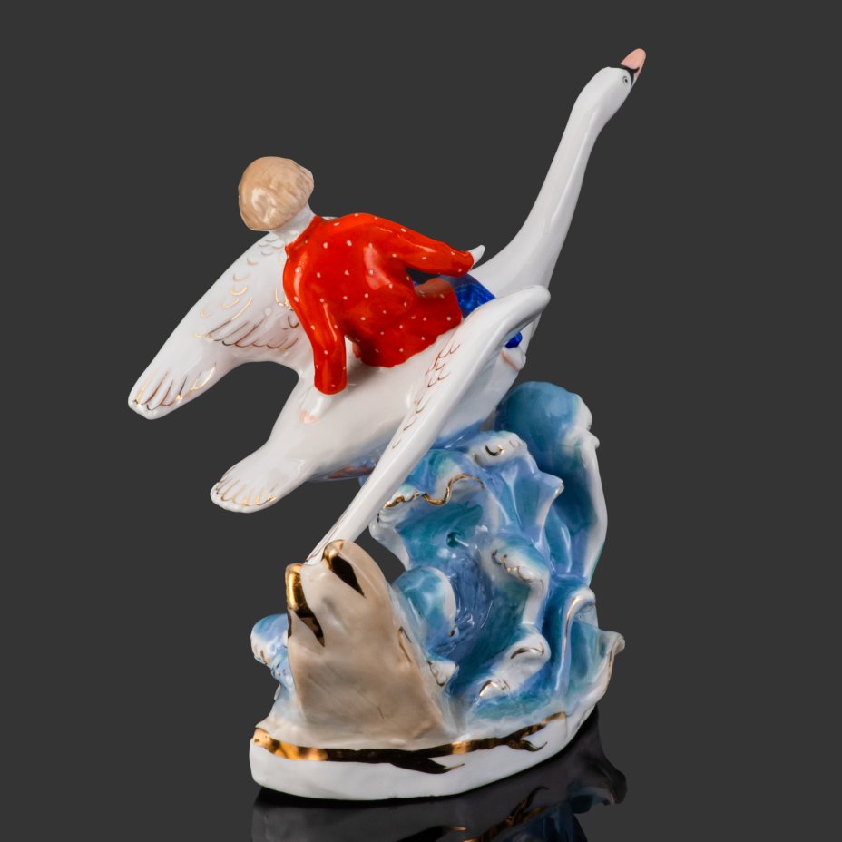 Статуэтка "Гуси-лебеди" ("Иванушка на лебеде"), скульптор П.М. Кожин, фарфор, роспись, золочение, Дулевский фарфоровый завод (Дулёво), СССР, 1956 г.