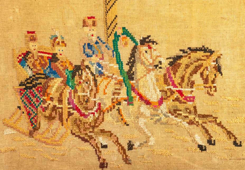Вышивка "Тройка" в раме, ткань, вышивка, дерево, Россия, 1900-1920 гг.