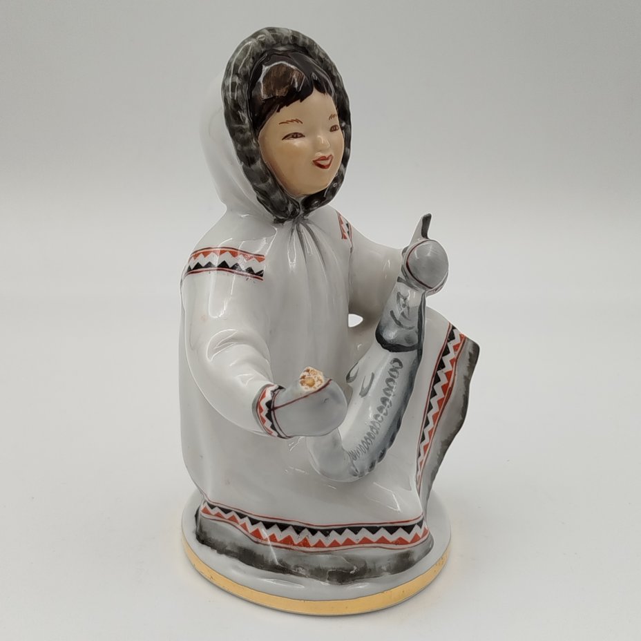 Статуэтка "Девочка-якутка с севрюгой", фарфор, роспись, Ленинградский фарфоровый завод (ЛФЗ), СССР, 1970-1980 гг.