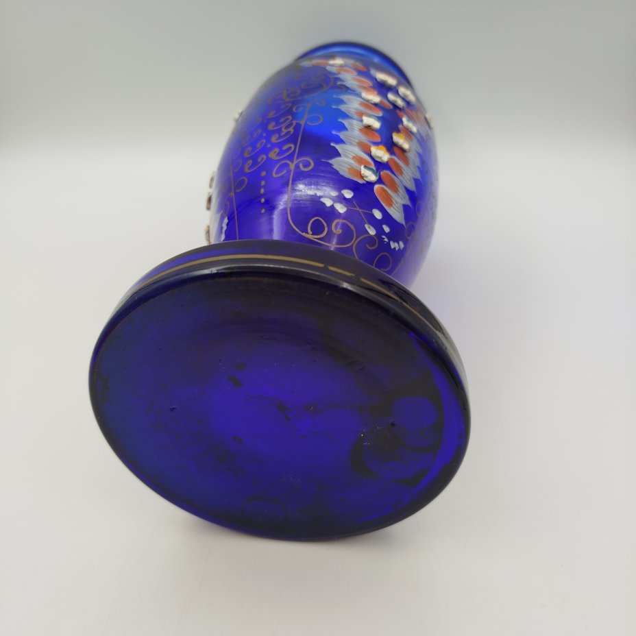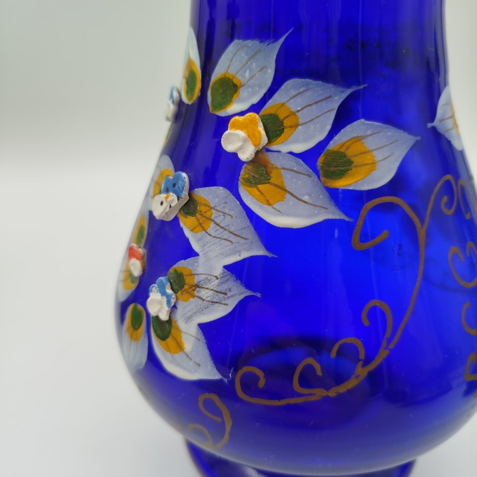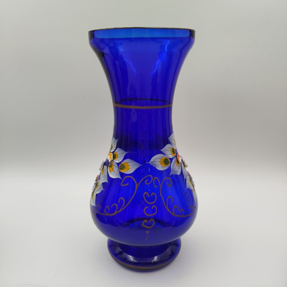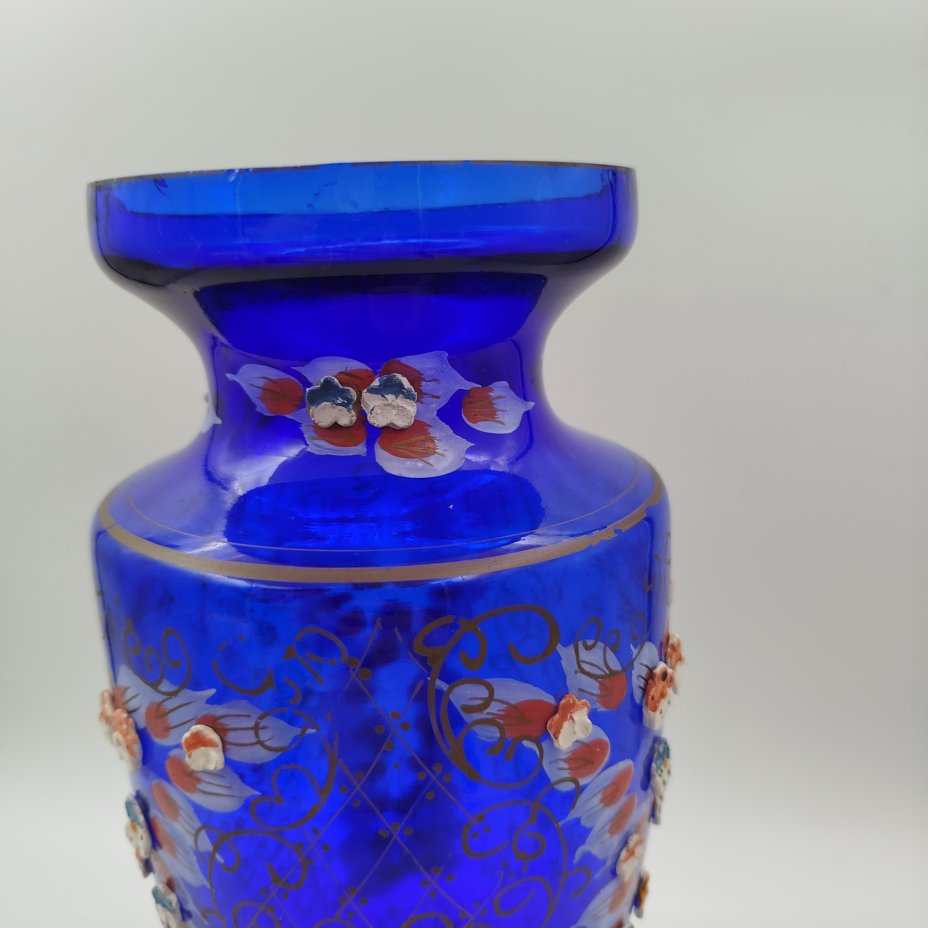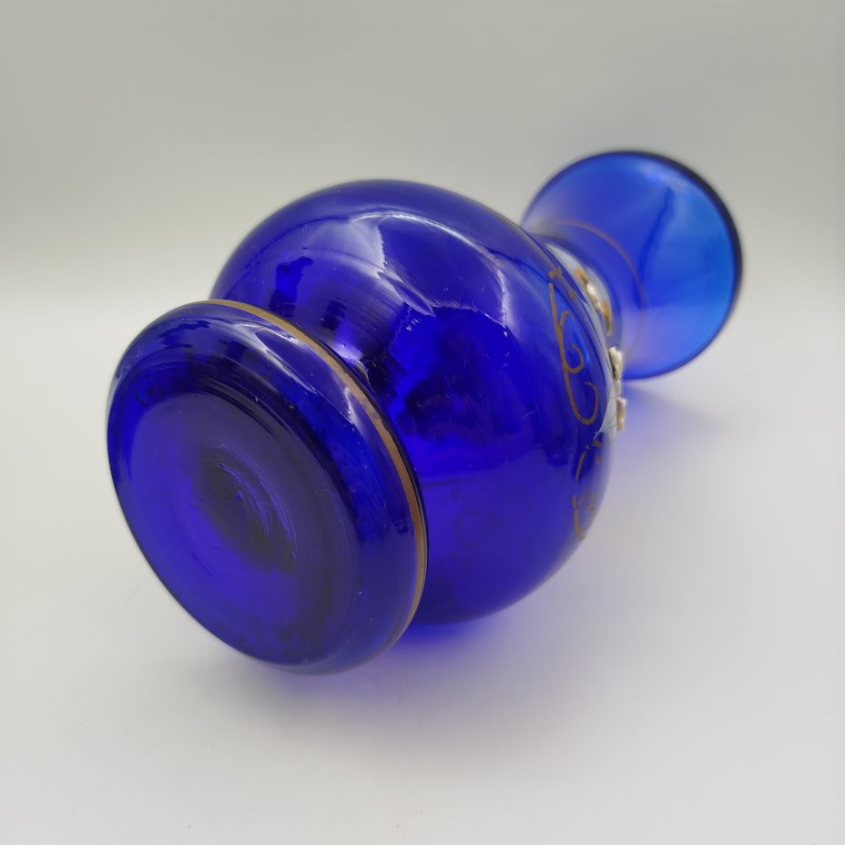 Ваза интерьерная, насыщенного синего цвета с цветочным декором, стекло, роспись, золочение, лепной декор, Чехословакия, 1960-1970 гг.