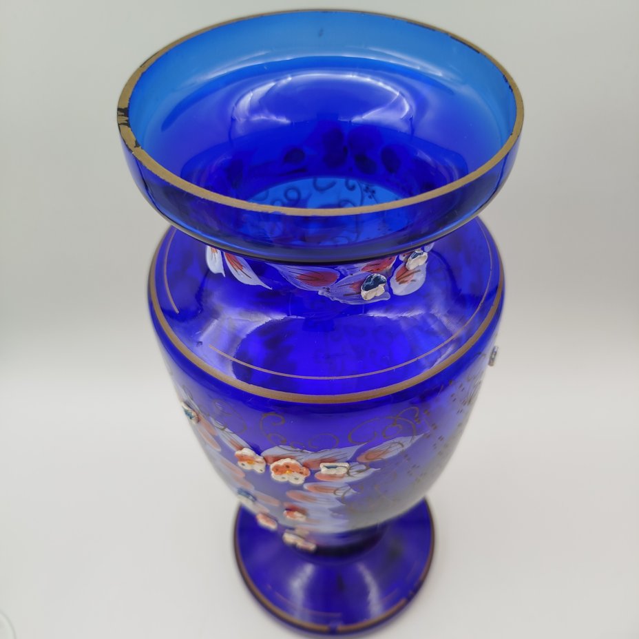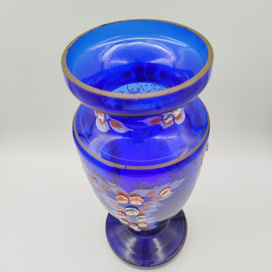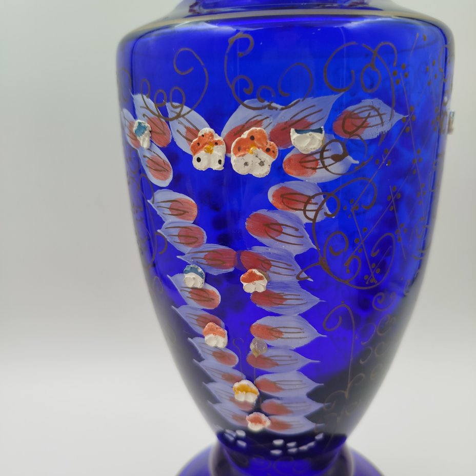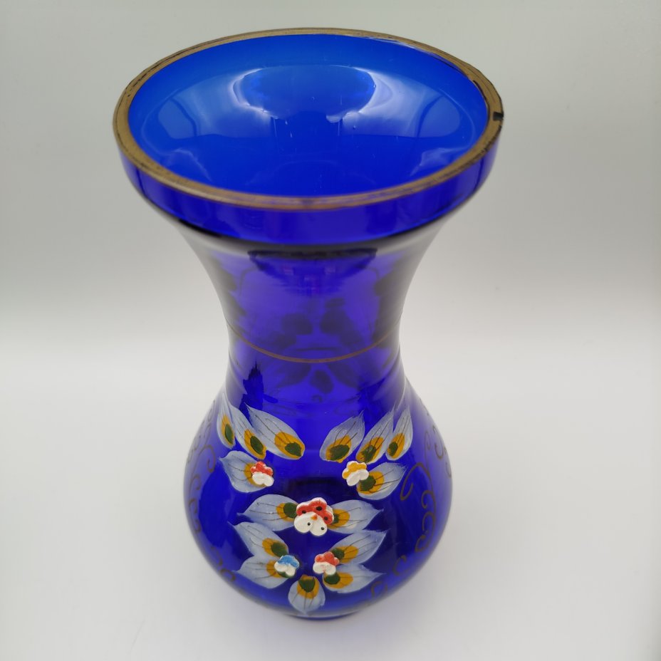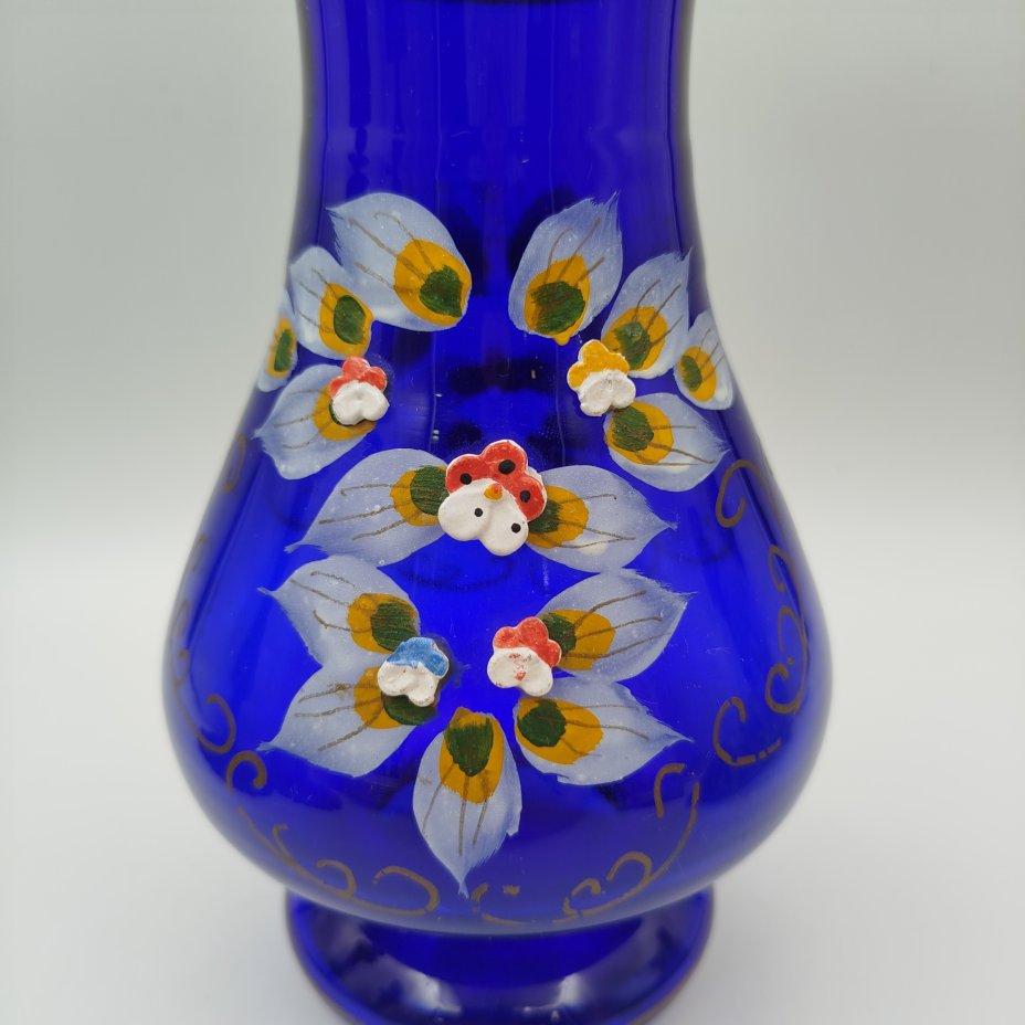 Ваза интерьерная, насыщенного синего цвета с цветочным декором, стекло, роспись, золочение, лепной декор, Чехословакия, 1960-1970 гг.