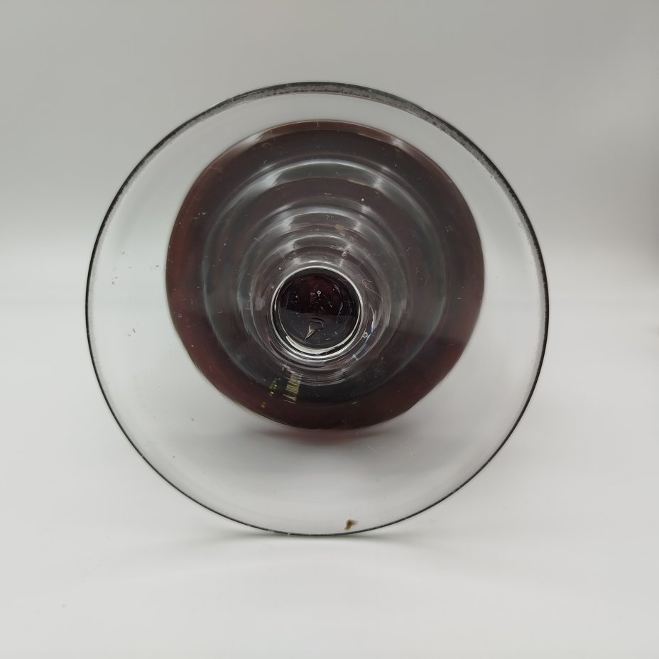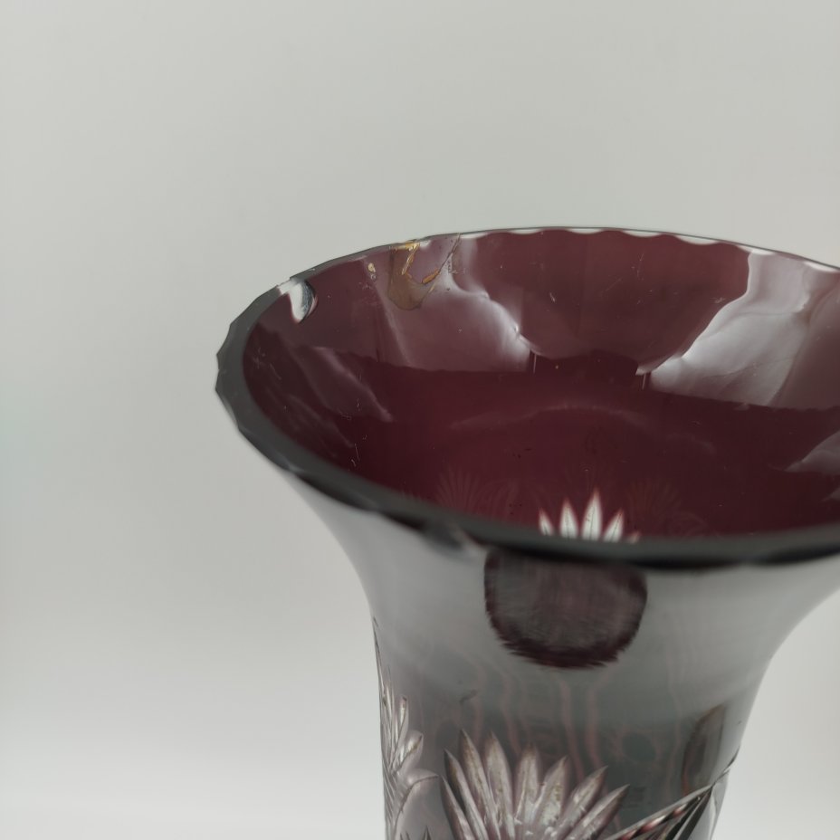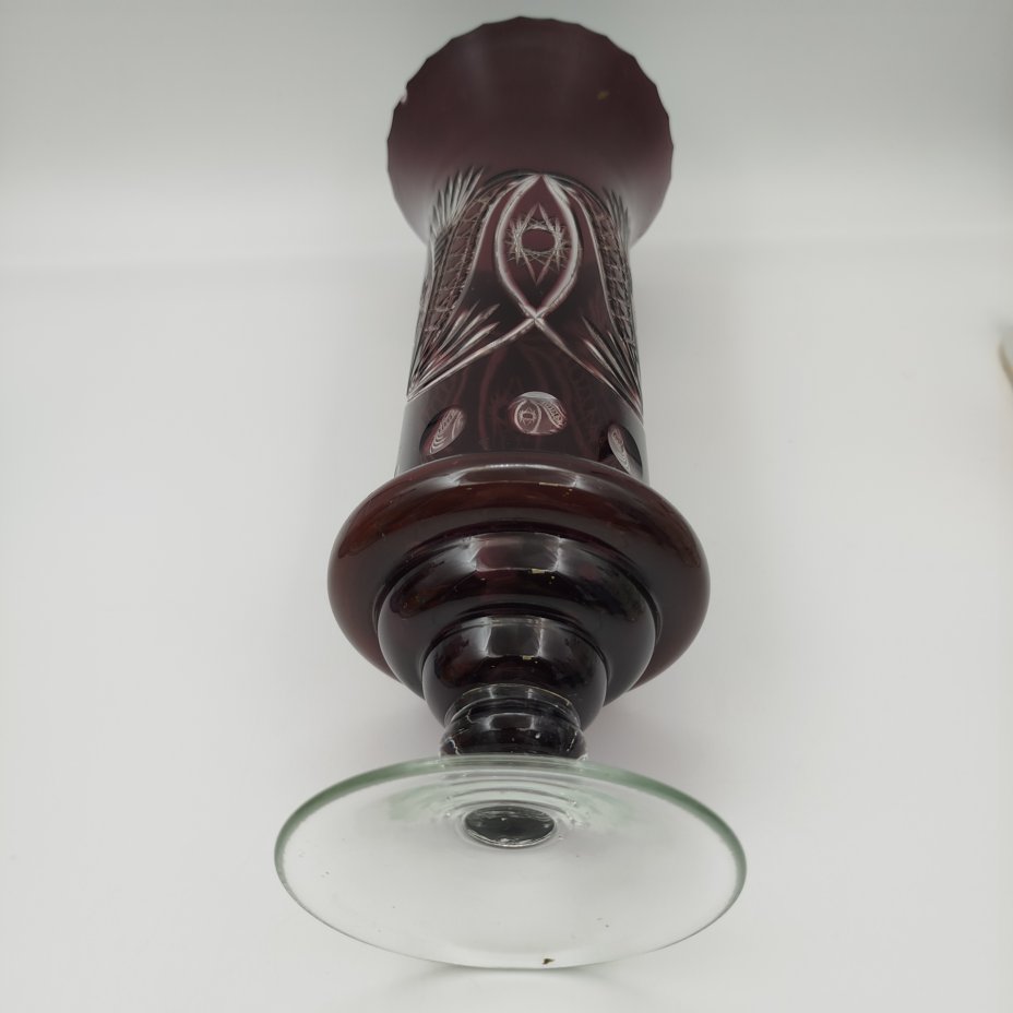 Ваза марганцевого оттенка на ножке с валиками и с цилиндрическим туловом, украшенным звездчато-растительным декором и линзами, хрусталь, алмазная грань, Дятьковский хрустальный завод, СССР, 1950-1970 гг.