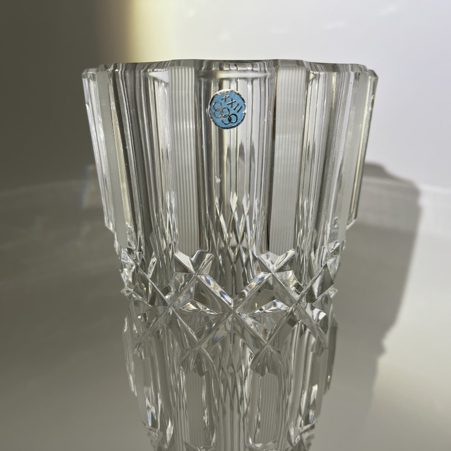 Ваза для цветов "Эхо", автор А.М. Остроумов (с олимпийской наклейкой), хрусталь, алмазная грань, Ленинградский завод художественного стекла (ЛЗХС), СССР, 1970-1980 гг.