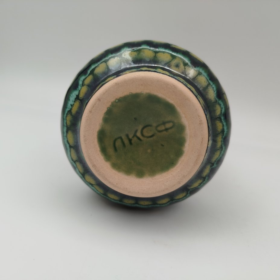 Ваза оригинальной формы, крашенная потечными поливами в сине-желто-зеленой гамме, керамика, глазурь, Львовская керамико-скульптурная фабрика (ЛКСФ), СССР, 1970-1990 гг.