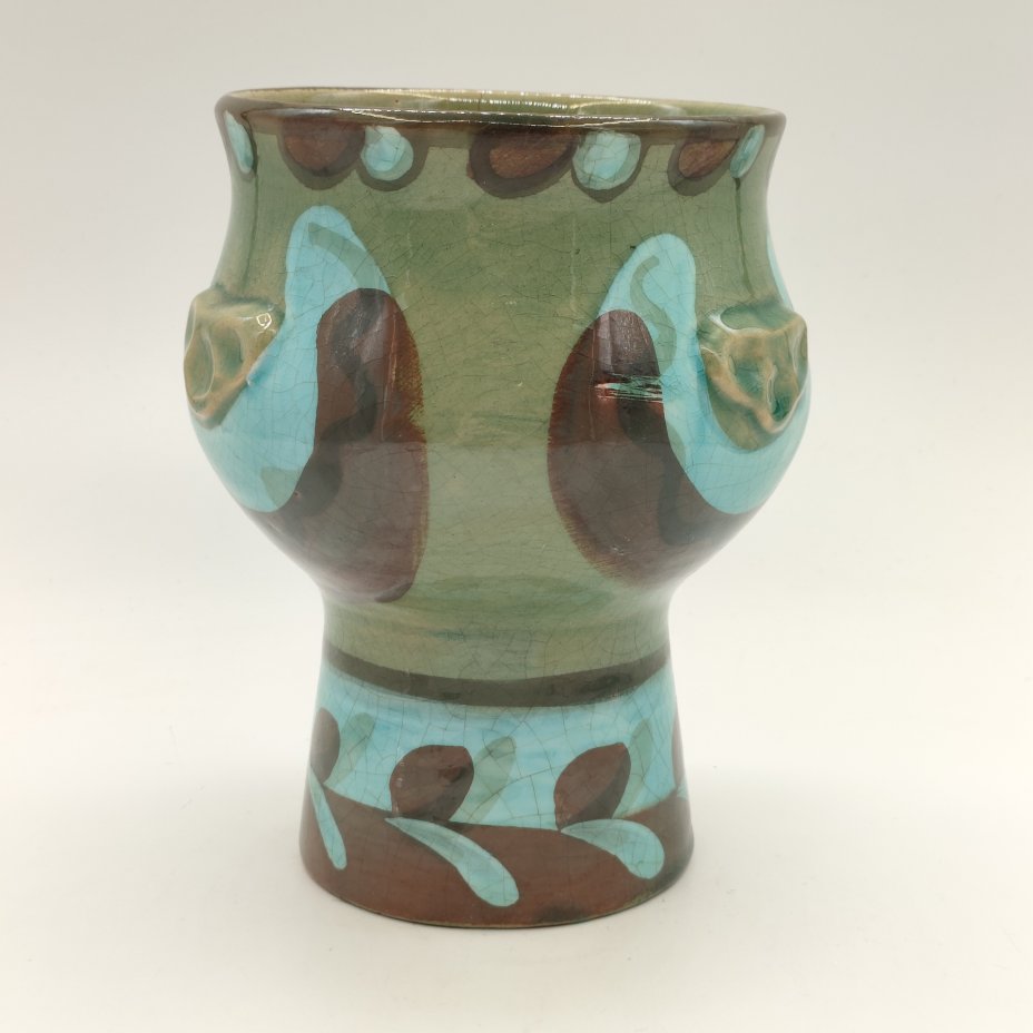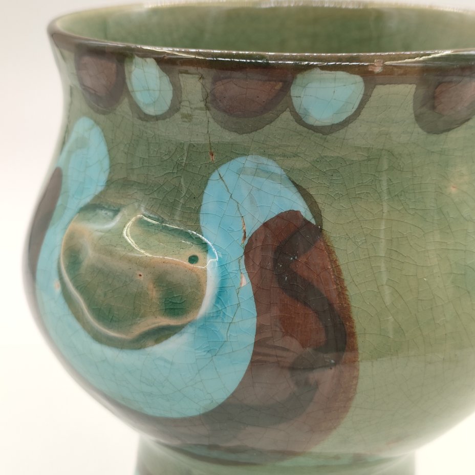 Ваза на высокой ножке, украшенная рельефным орнаментальным декором, керамика, глазурь, роспись, СССР, 1970-1990 гг.