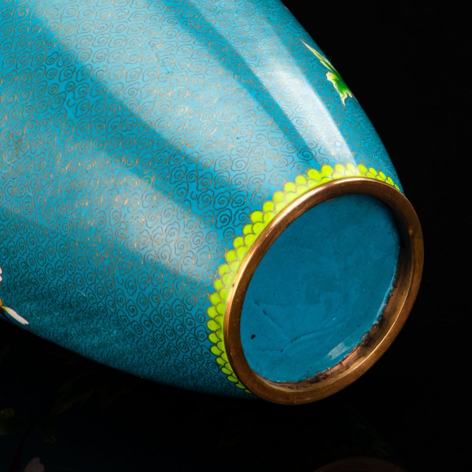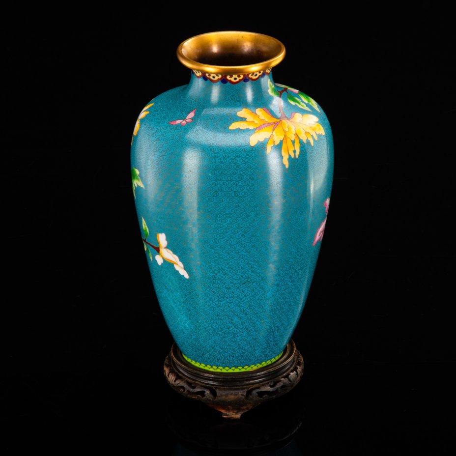 Ваза на подставке, украшенная цветущими цветами на бирюзовом облачном фоне, медь, перегородчатая эмаль (клуазоне), Китай, 1960-1980 гг.