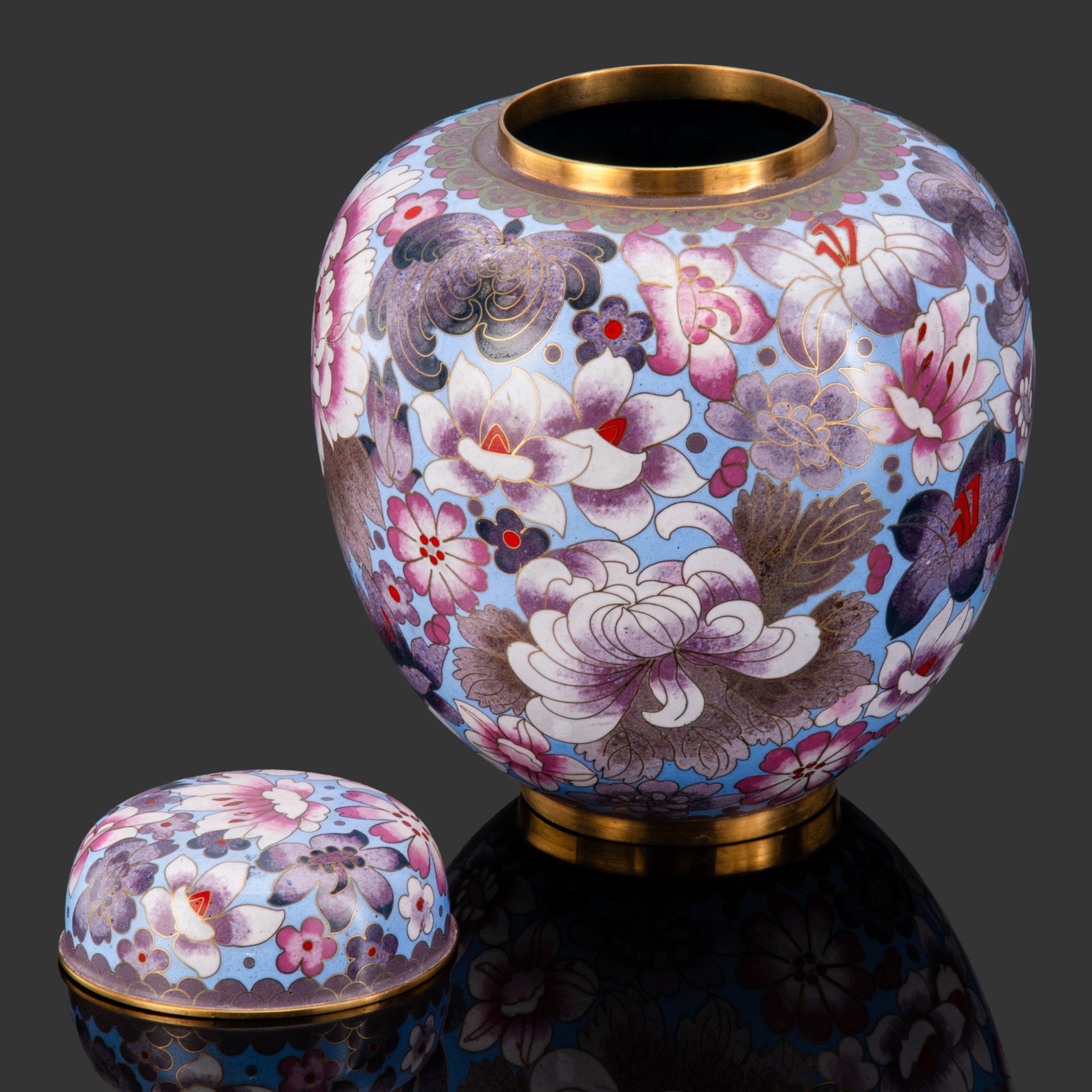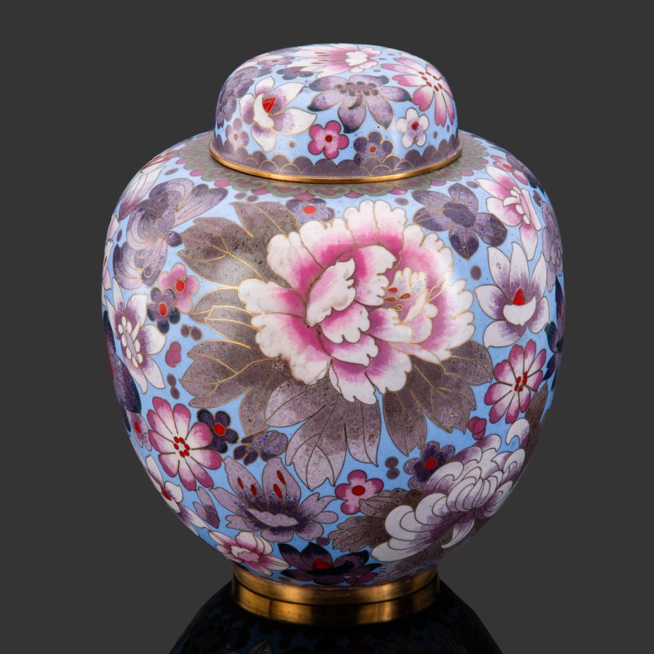 Ваза с крышкой пузатой формы (имбирная ваза), украшенная цветами, латунь, эмаль, техника клуазоне, Китай, 1970-1990 гг.