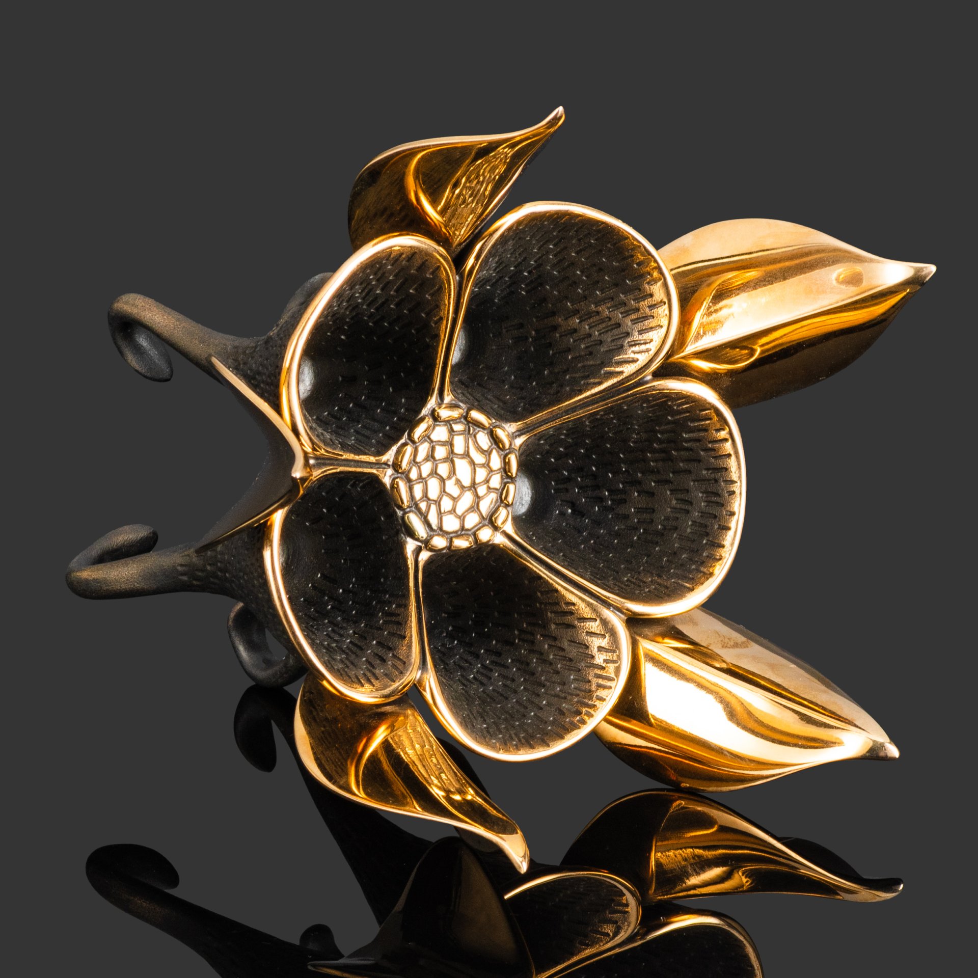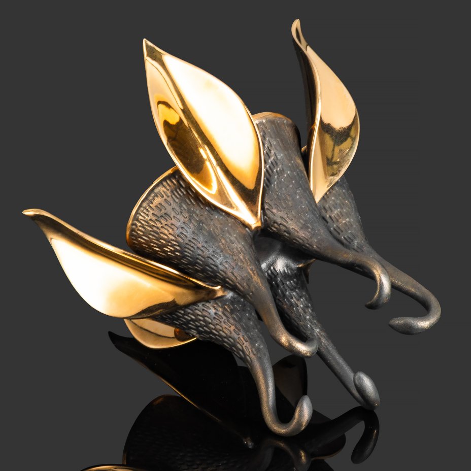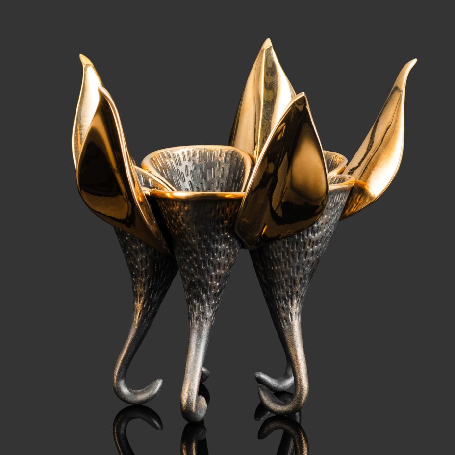 Бронзовый цветок Экзотическая Аквилегия является сложным и неординарным предметом интерьера. Он оригинален и неожиданен по своей форме и исполнению. Прообразом столь оригинального изделия послужил нежный цветок альпийской аквилегии. Пять гладко отполированных чашелистиков, порфитки выполненные в форме пяти лепестков, переходящих в шпорцы, которые стали изящными, тонкими ножками вазочки-подсвечника. Бронзовый цветок многофункционален. Вы можете установить в нем пять обычных высоких свечей или поместить в центр одну, но большую, например ароматизированную, или же поместить в цент цветка маленькую чайную свечу, свет который погрузит вас в тайну и загадочность мироздания, добавит романтики, а отсвет пламени на полированной бронзе придаст обстановке неповторимый уют и гармонию. В лепестках нашей аквилегии можно хранить мелкие предметы, а можно положить колечки, снятые перед сном. Тонкая детализация, отточенность линий, оригинальность идеи, реализованные в вазочке-подсвечнике Экзотическая Аквилегия, делают ее неповторимой и удивительной. Вазочка-подсвечник Экзотическая Аквилегия, благодаря своей неординарности, станет прекрасным подарком к любому празднику или знаменательному событию.