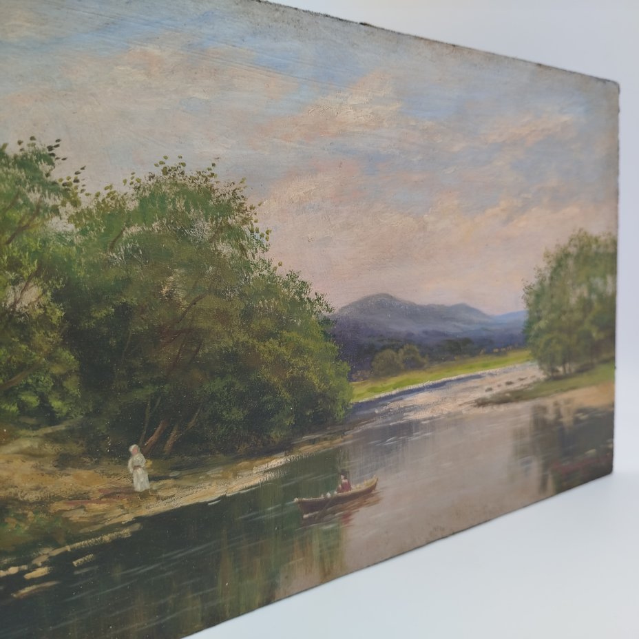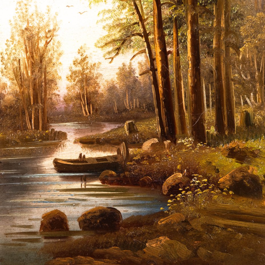 Картина "Пейзаж с деревьями, водоемом и лодкой", оформленная в раму, неизвестный художник, дерево, фанера, масло, Россия, 1900-1940 гг.