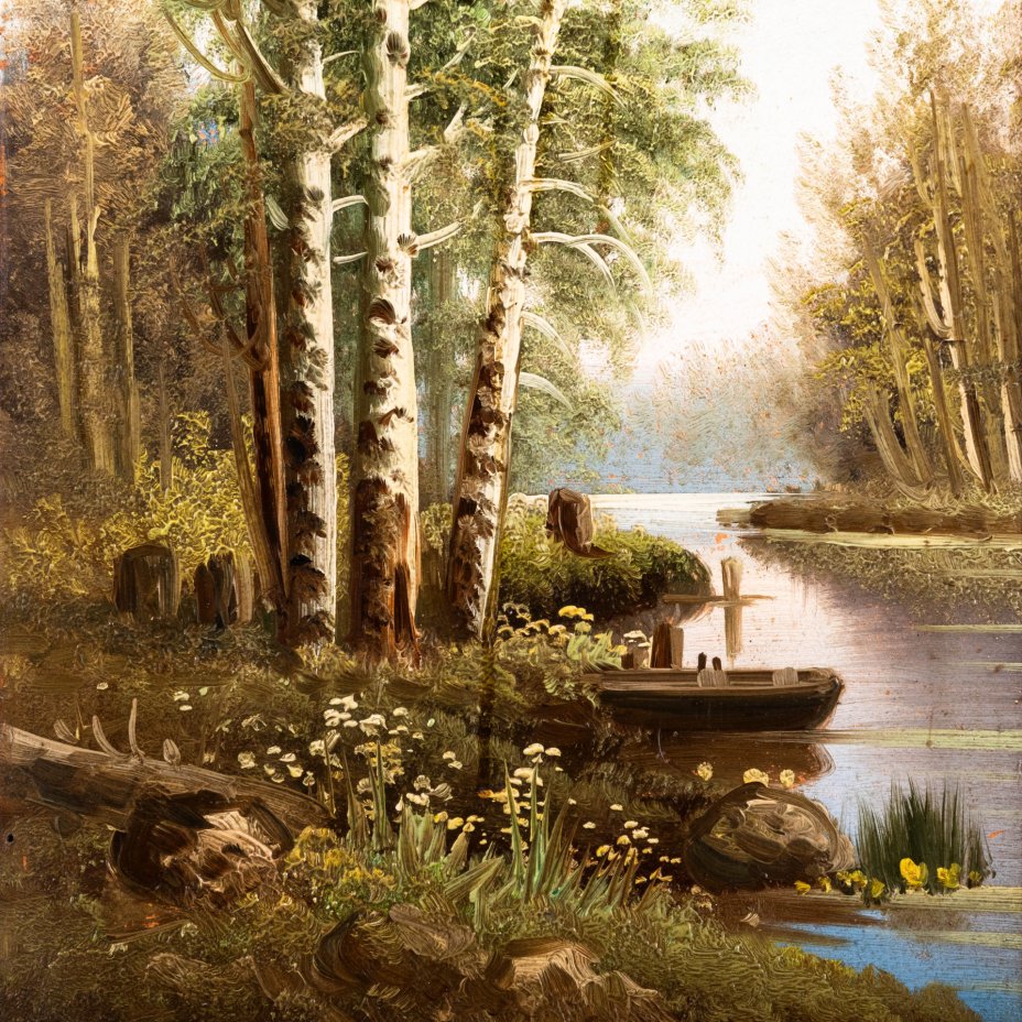 Картина "Пейзаж с березами, водоемом и лодкой", оформленная в раму, неизвестный художник, дерево, фанера, масло, Россия, 1900-1940 гг.