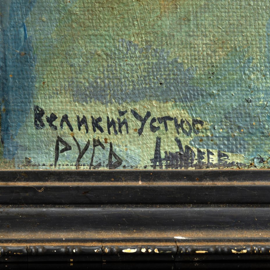 Картина "Великий Устюг", оформленная в раму, автор Виктор Васильевич Андреев (1963-2014 гг.), творческое объединение "Русь", холст, масло, дерево, Россия, 1984-1990 гг.