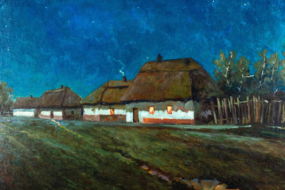 Картина "Летняя ночь в Малороссии" (копия работы Евгения Ксаверьевича Вржеща), оформленная в раму, неизвестный художник, дерево, оргалит, масло, Россия, 1910-1950 гг.