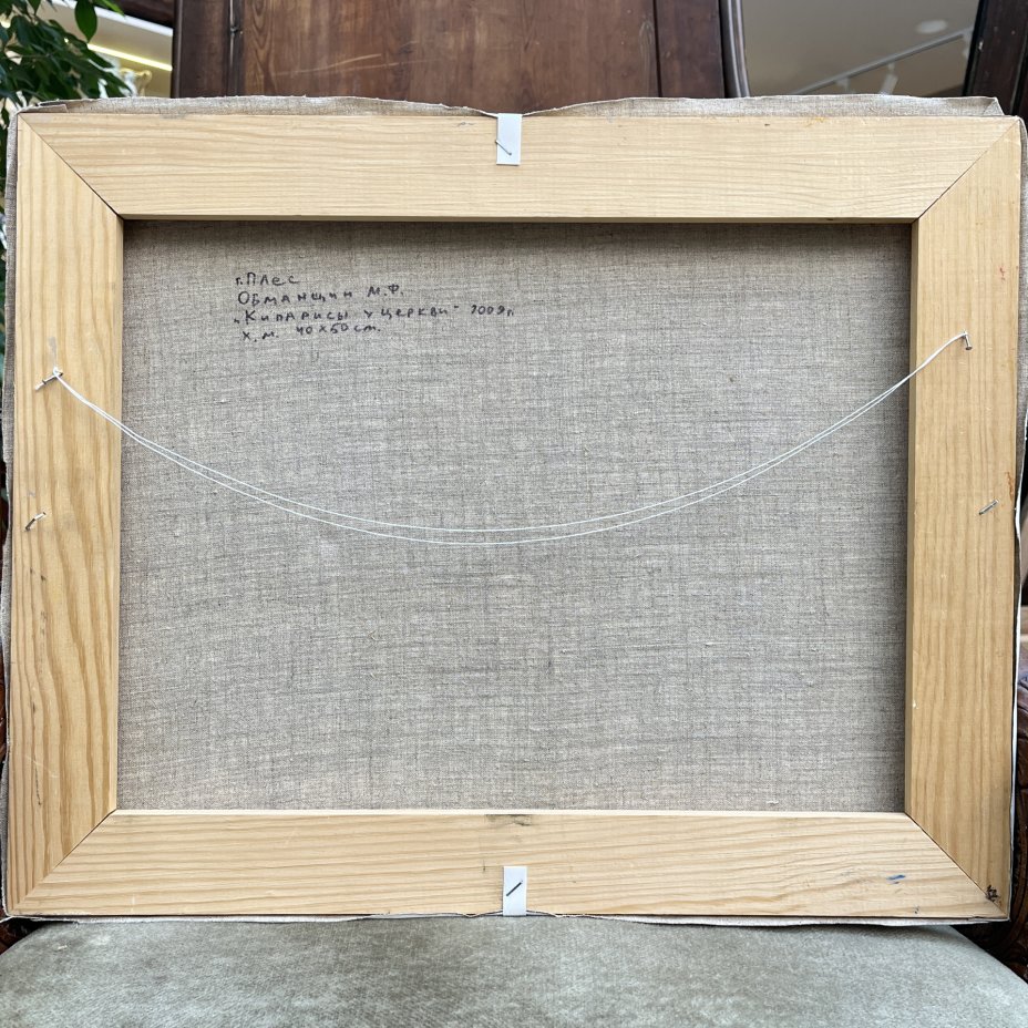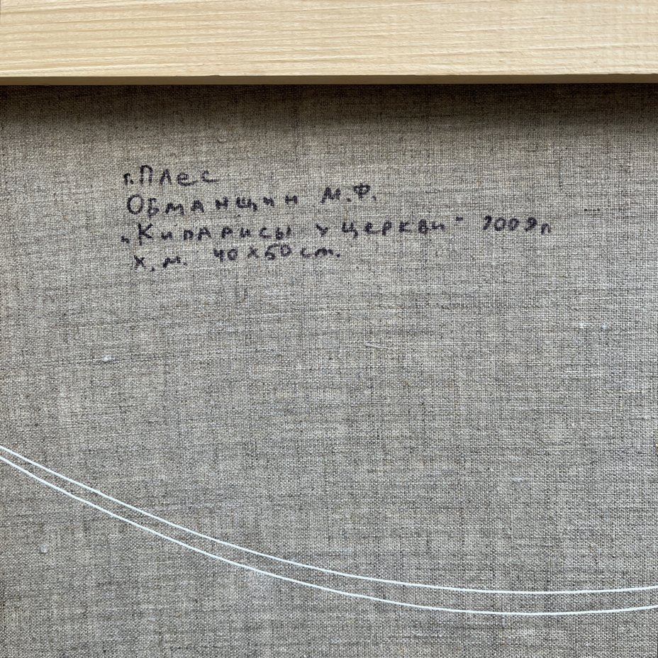 Картина "Кипарисы у церкви", автор Обманщин Михаил Федорович (1968 г. р.), холст, масло, в раме, Россия, 2009 г.