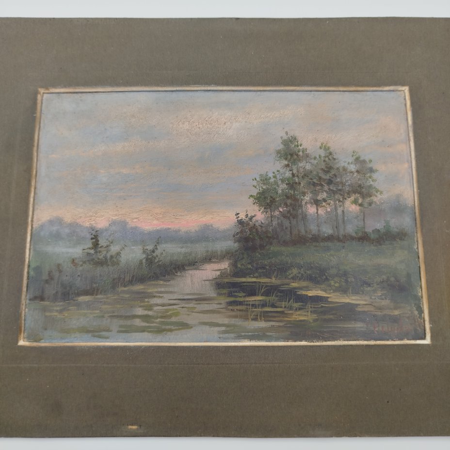 Картина "Вечерний пейзаж с водоемом" в паспарту, подпись "Федоровъ", картон, масло, Россия, 1970-2000 гг.