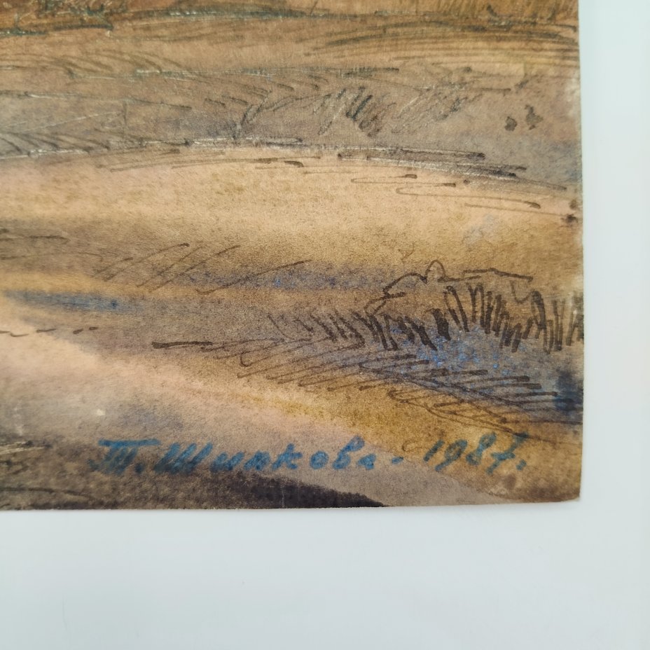 Этюд "Пейзаж с деревом", автор Т. Шипкова, бумага, смешанная техника, СССР, 1987 г.