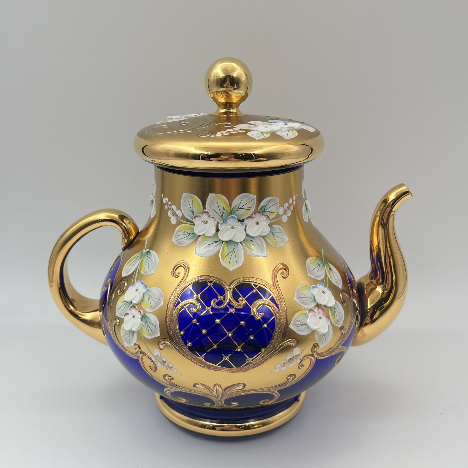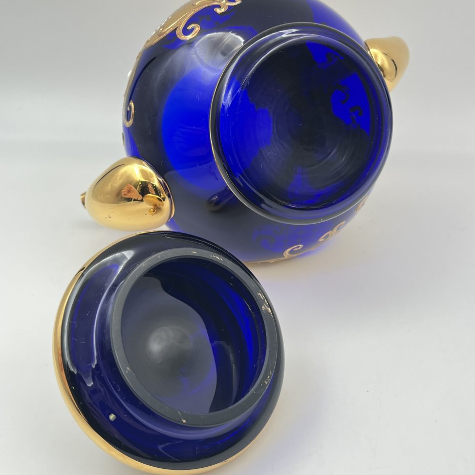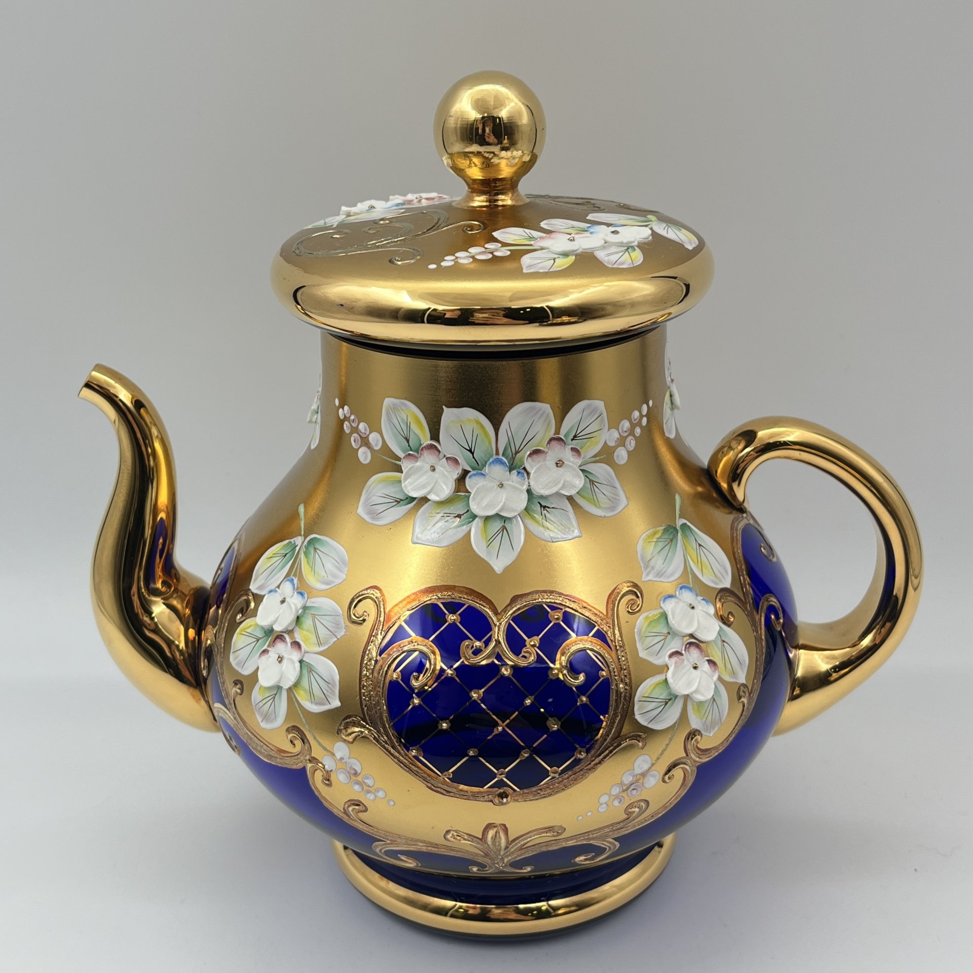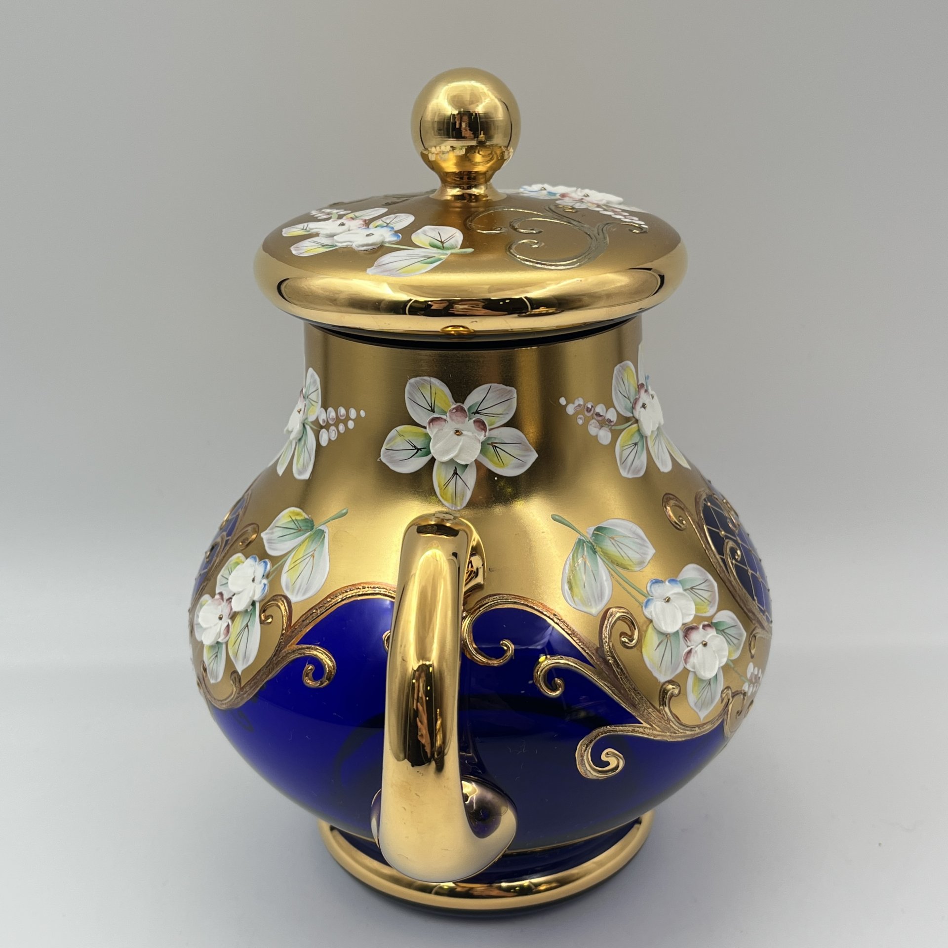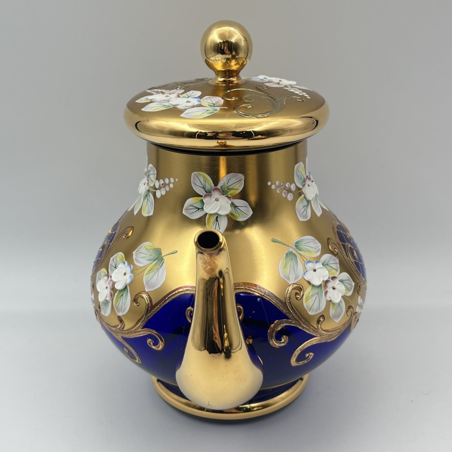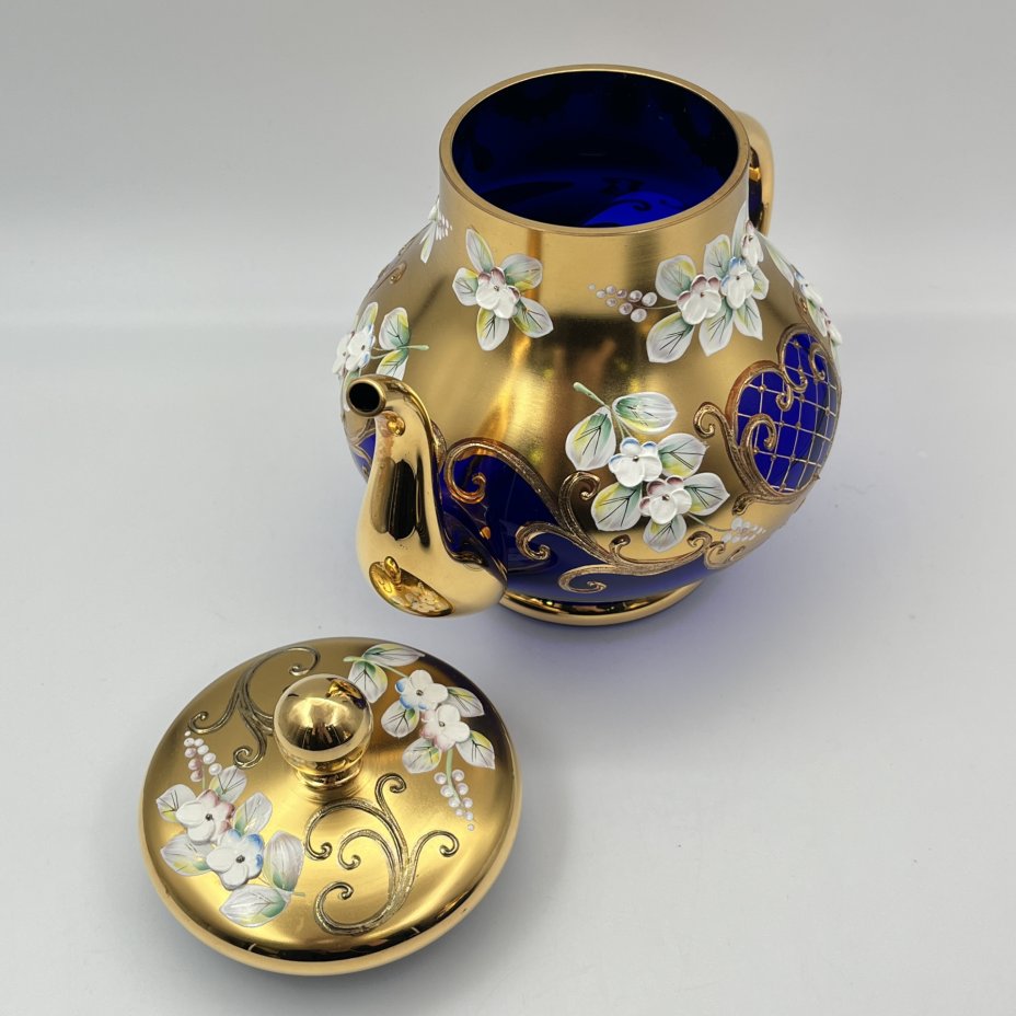 Чайник насыщенно-синего оттенка, украшенный лепным декором в виде цветов, стекло, золочение, роспись, налепы, Чехословакия, 1970-1990 гг.