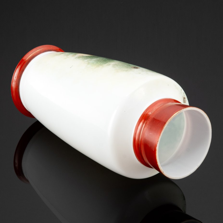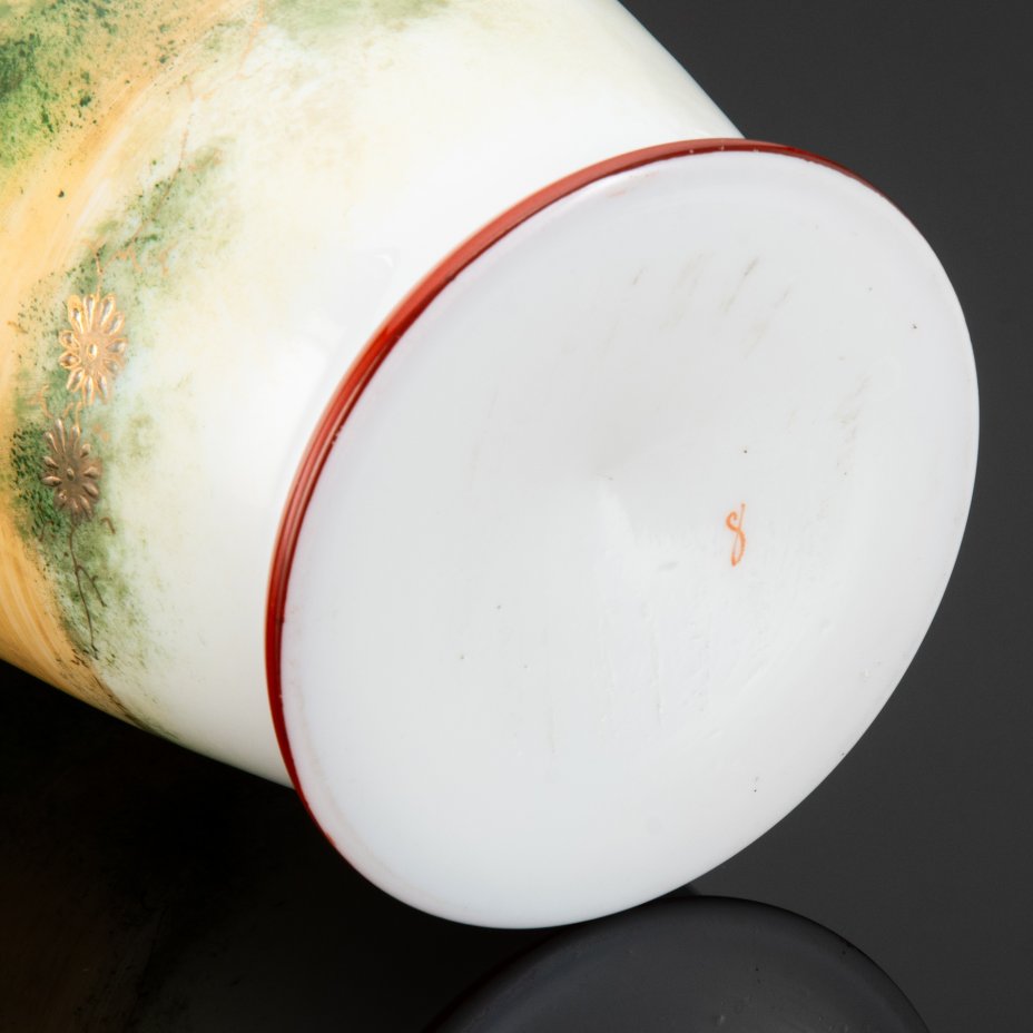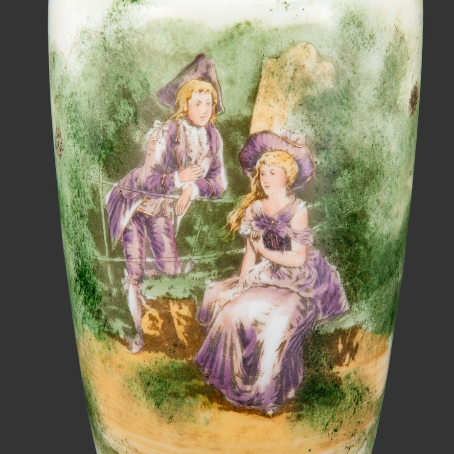 Ваза, украшенная изображением галантной сцены в саду, стекло, (молочное), роспись, деколь, Европа, 1930-1950 гг.