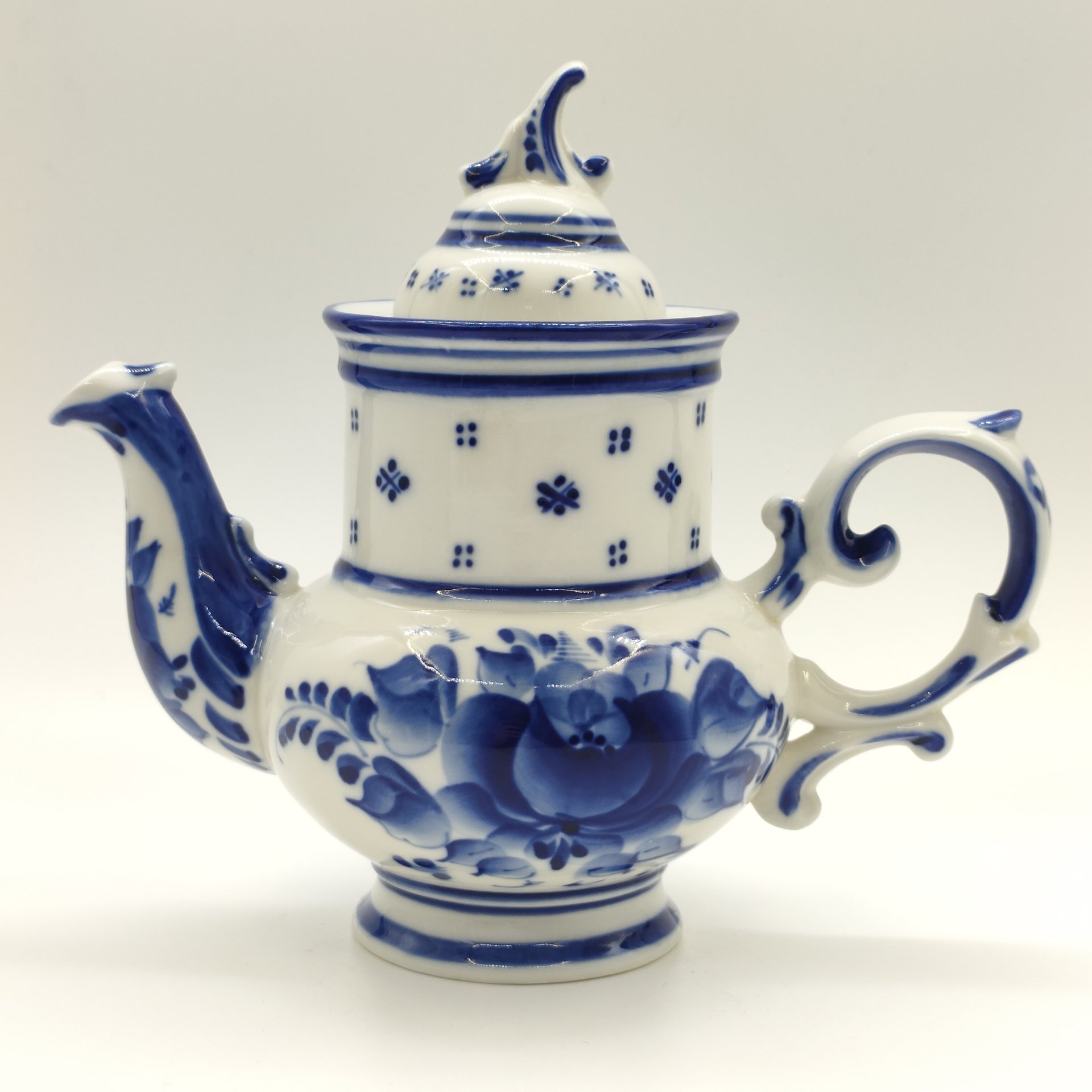 Чайник заварочный "Пион" с цветочным декором, р. Гребнева, Гжель, фарфор, роспись, Российская Федерация, 1990-2015 гг.
