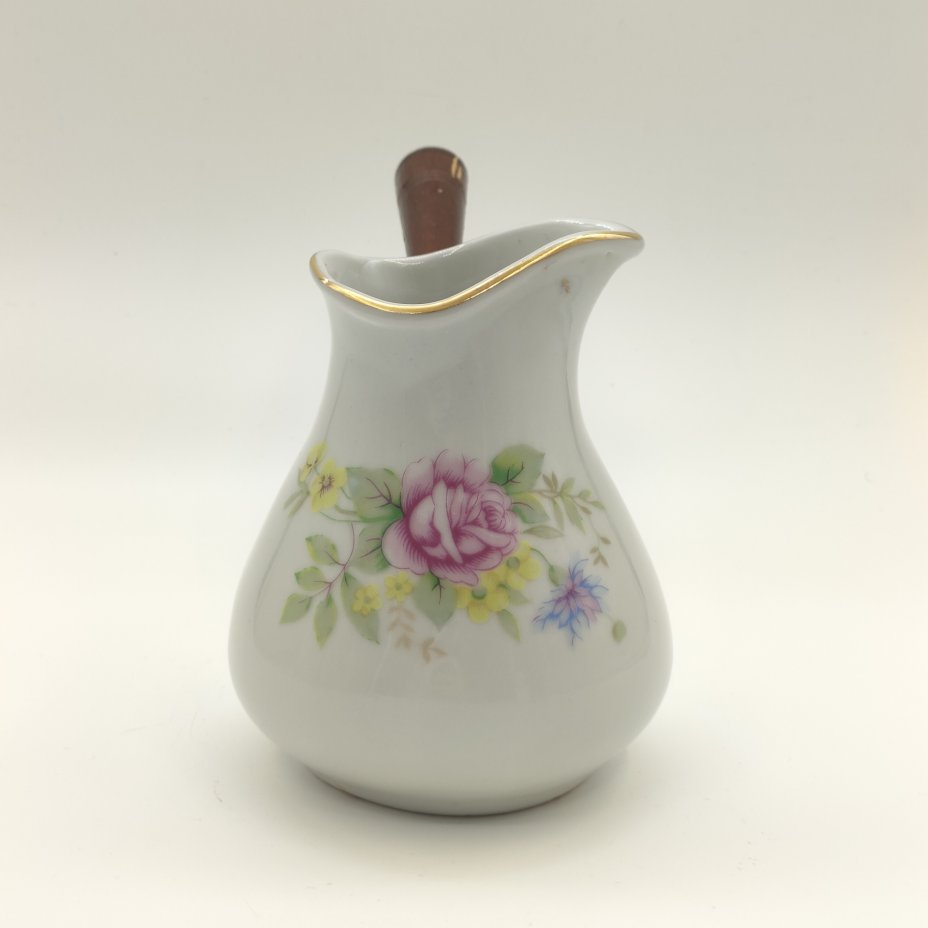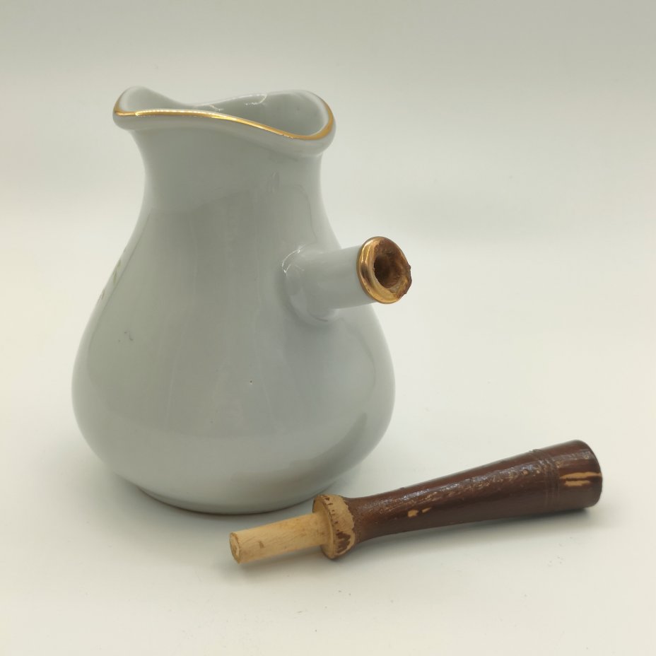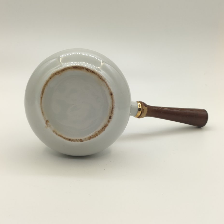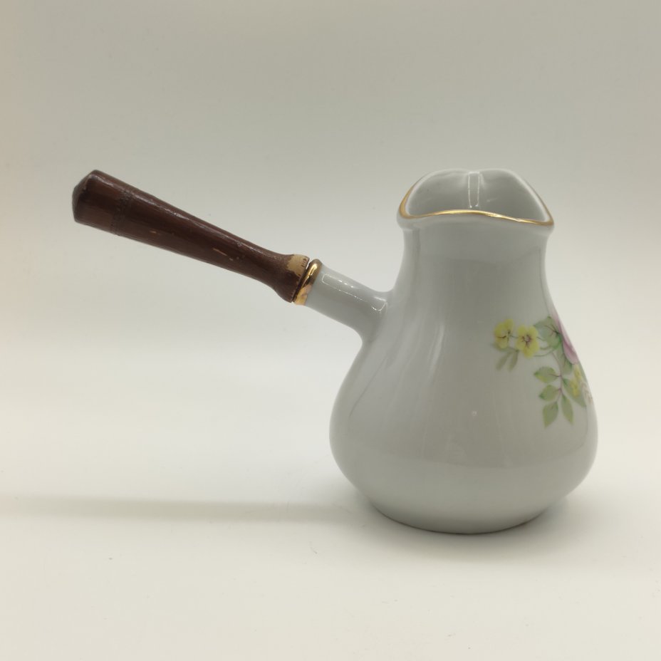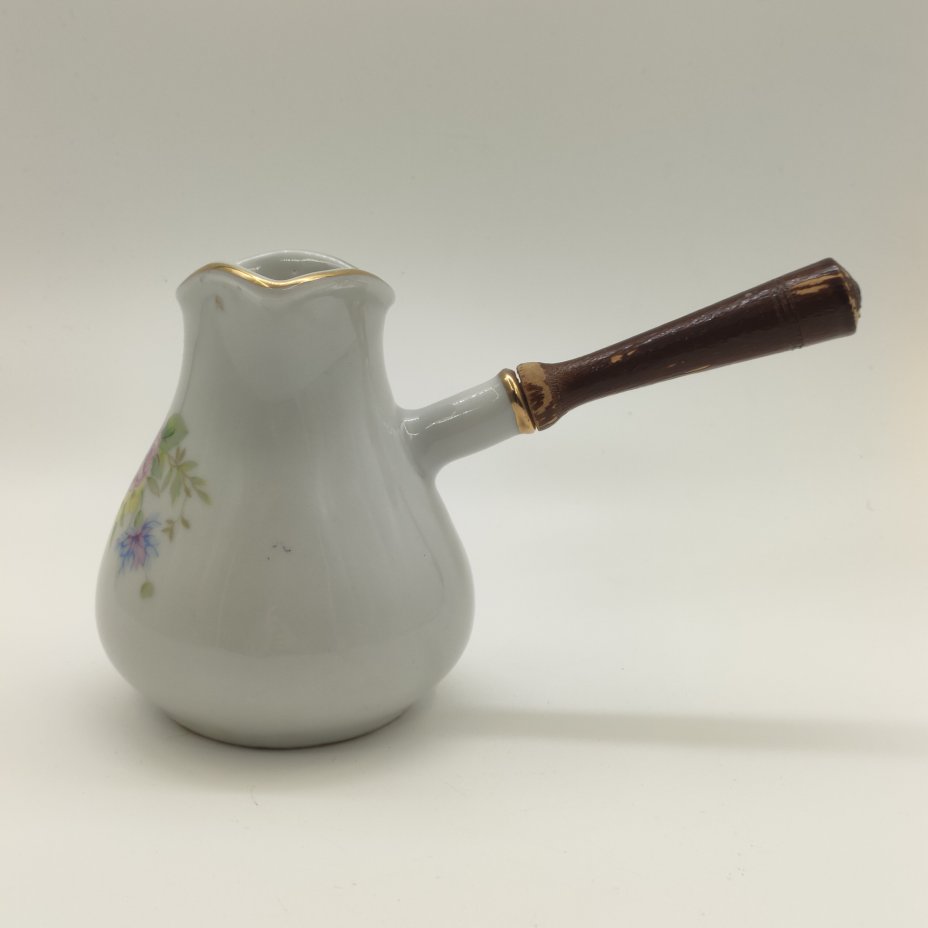 Турка с деревянной ручкой, украшенная декором в виде цветов, фарфор, дерево, деколь, золочение, лак, СССР, 1970-1990 гг.